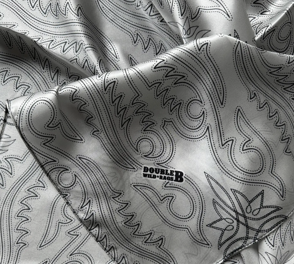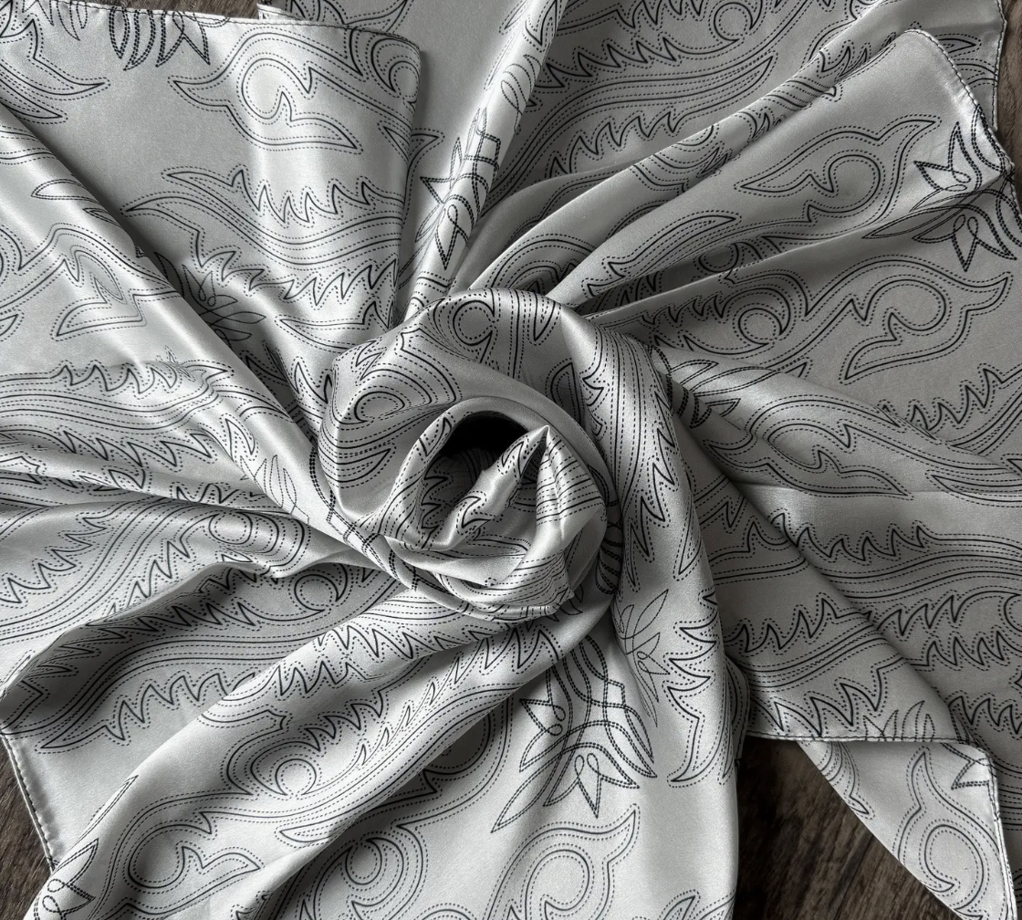 The boot stitch graphic is so popular now! check out our twist on a wild rag Color: light grey silver with black boot stitch patterns Size: 34"x34" (standard) or 42"x42" (x large) Material: 100% Silk - Mulberry Weight: 12 mm - Lightweight, Soft, Durable, Moisture wicking ****Silk is a very smooth, light fabric that's usually made of fibers from silkworm cocoons. Silk is often an expensive kind of fabric from which various high end pieces of clothing can be made. Scarves made of silk are soft and satiny, and they usually have an almost glossy sheen.