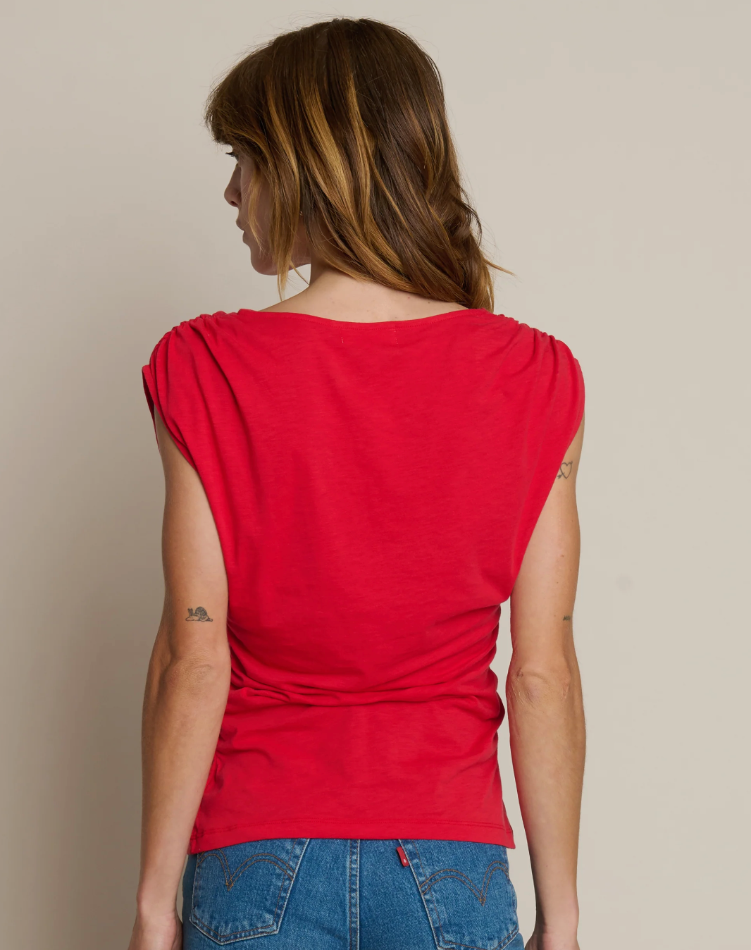 The Aime Asymmetrical Tee offers a modern silhouette with thoughtful detailing—crafted from 100% pima cotton in a fitted, sleeveless cut. Soft shirring adds texture—an unfussed detail that does the styling work for you.