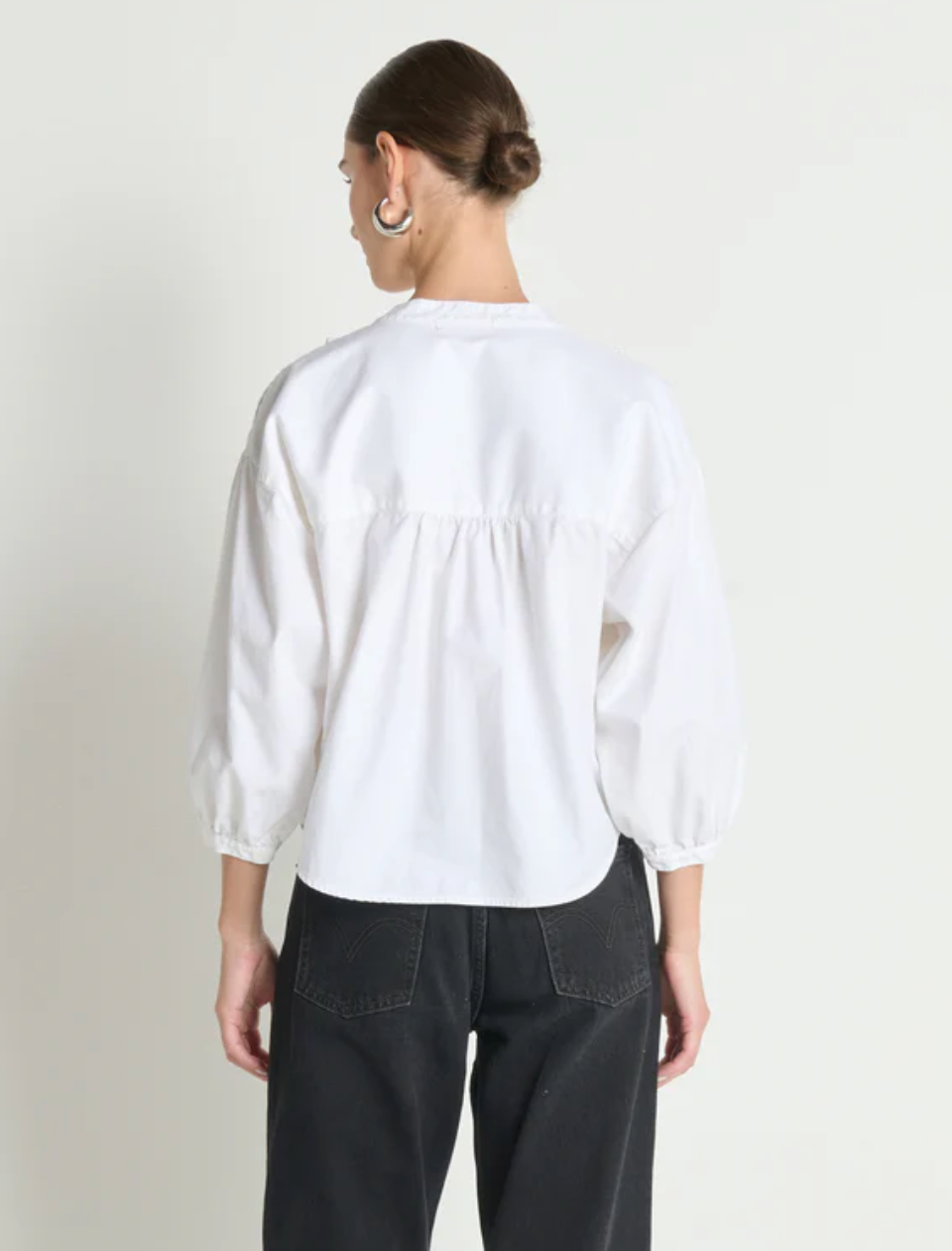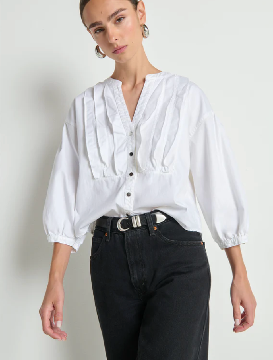 The Amelia Ruffle Shirt brings effortless texture and an element of interest to the everyday. Made of 100% cotton in a boxy, cropped fit.