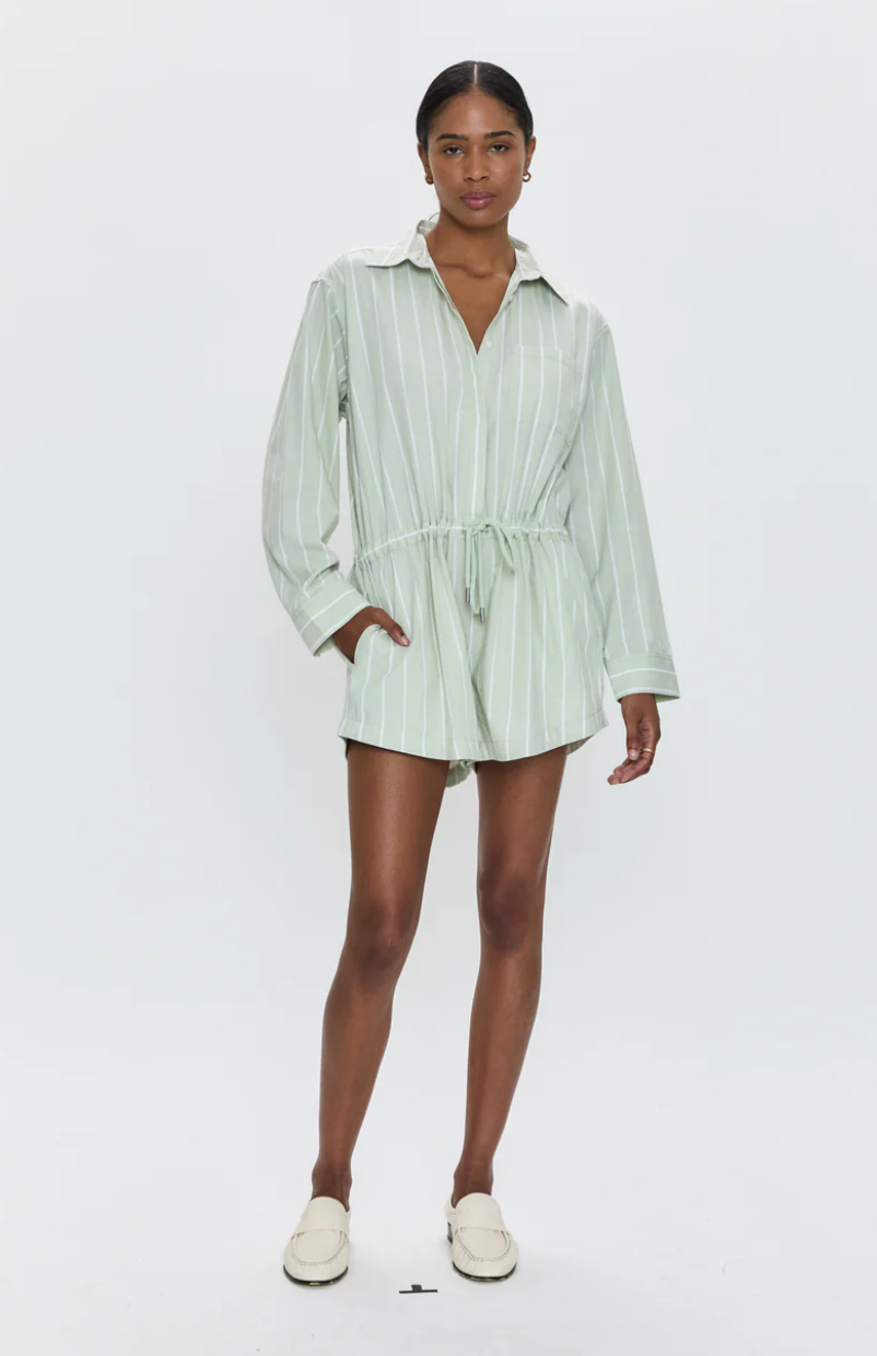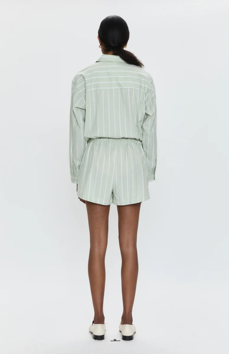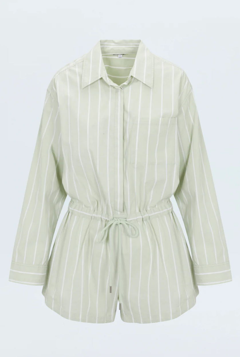 Breezy, transitional romper crafted from lightweight cotton poplin. Designed with a collared, button up bodice that falls into a relaxed short silhouette with an adjustable drawstring waist. Pistachio Stripe is a cool like green contrasted by a white pinstripe overlay.