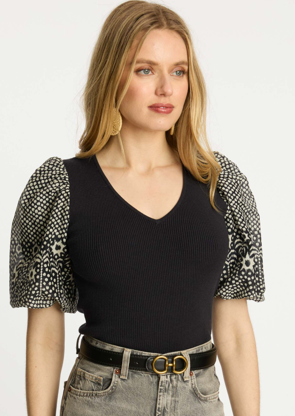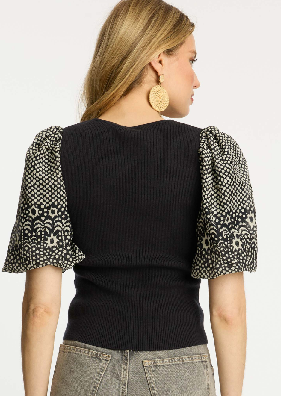 Made from a comfortable stretch knit with silk-cotton sleeves, this top offers the perfect balance of modern polish and playful detail. Effortless to style, it pairs beautifully with denim or tailored pieces alike.
