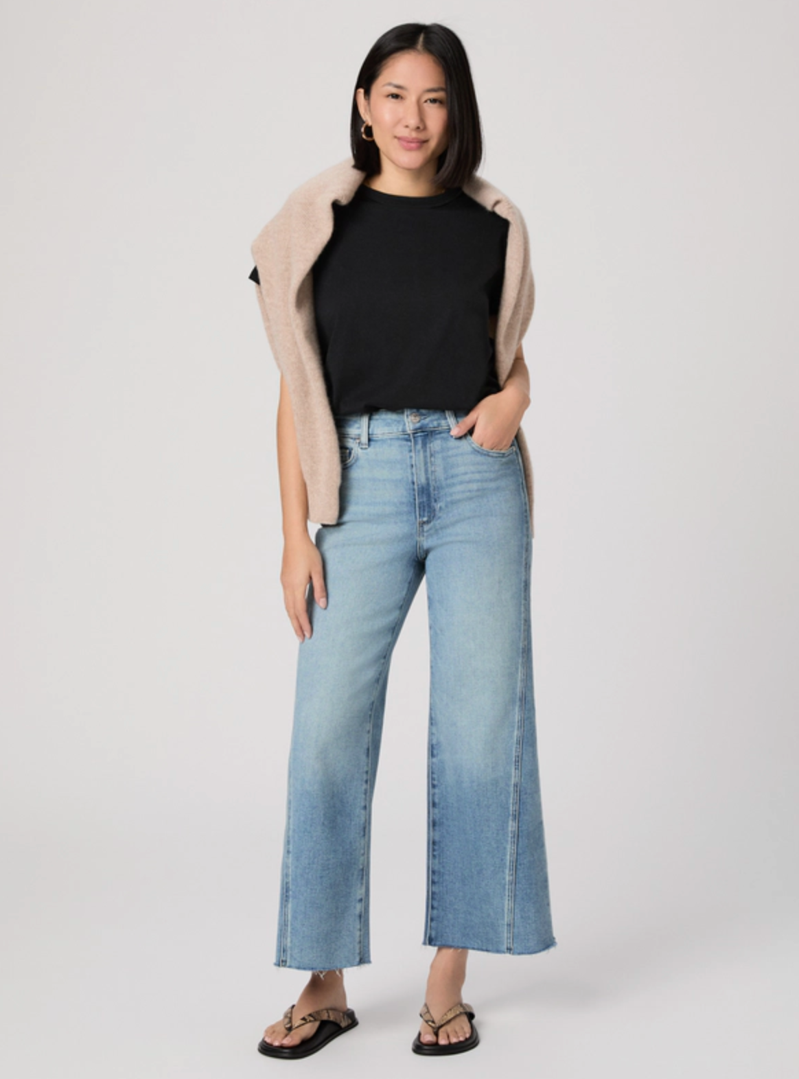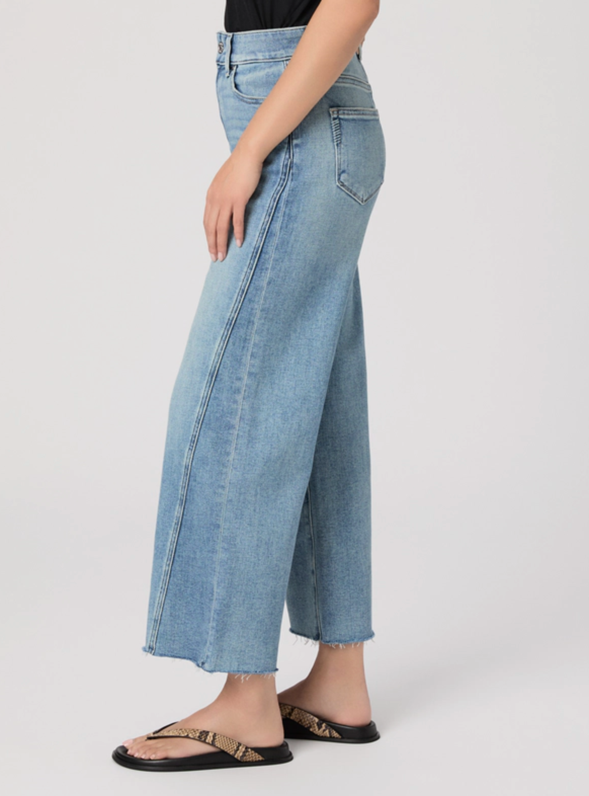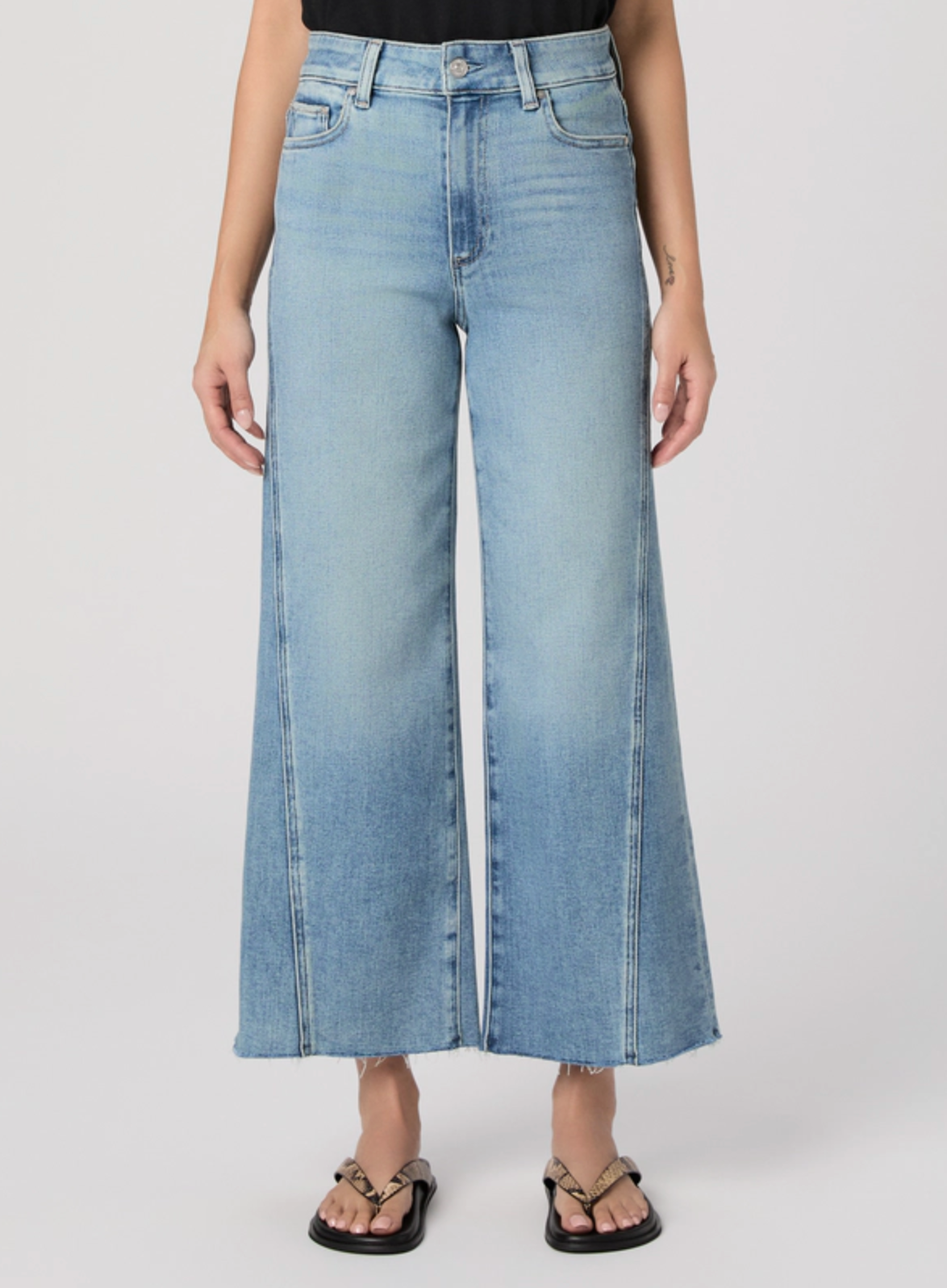 Anessa is our high-waisted wide leg with a slightly relaxed fit and an ankle length inseam. Cut from TRANSCEND VINTAGE denim in a light wash with twisted outseam panels and a raw hem, this pair combines the signature comfort of Transcend with rich denim character for a lived-in look.