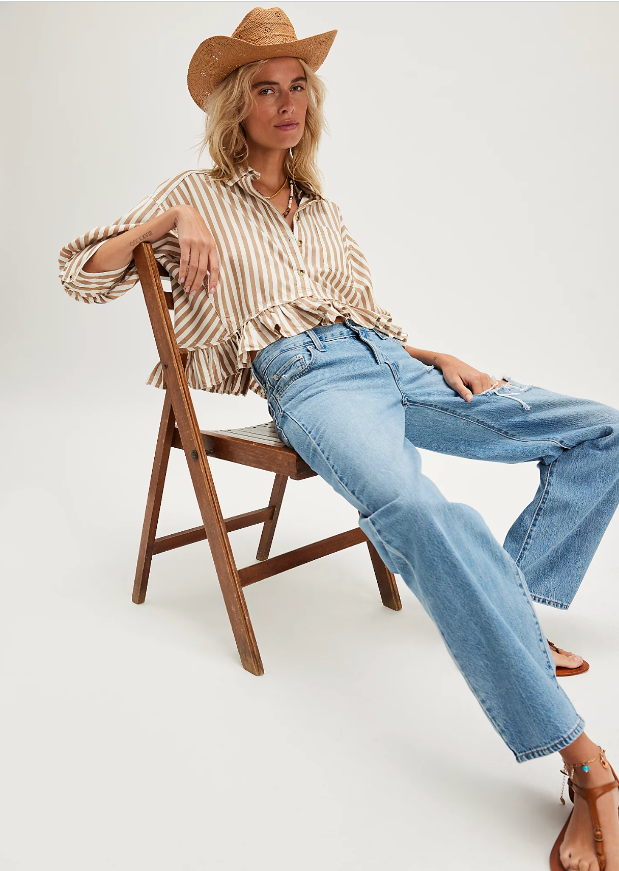 A feminine take on the classic button-down, this shirt from the We The Free collection is featured in a striped fabrication and collared-neckline with ¾ sleeves.