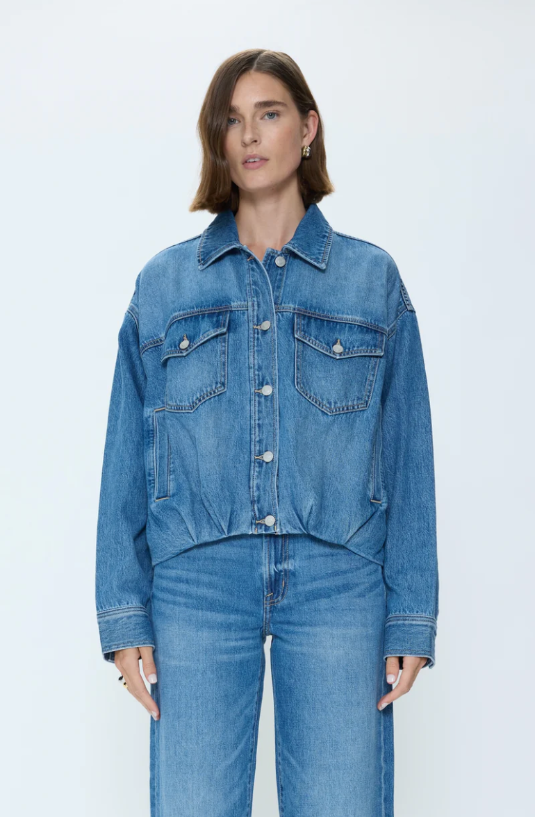 The Bibi reimagines the classic denim jacket with a softly structured, blouson silhouette. Cut from 100% cotton non-stretch denim, it holds its shape while offering a relaxed drape and subtle volume that makes a statement. Designed with dropped shoulders, clean seaming, and a slightly cropped length, the Bibi’s balanced proportions offer easy styling.