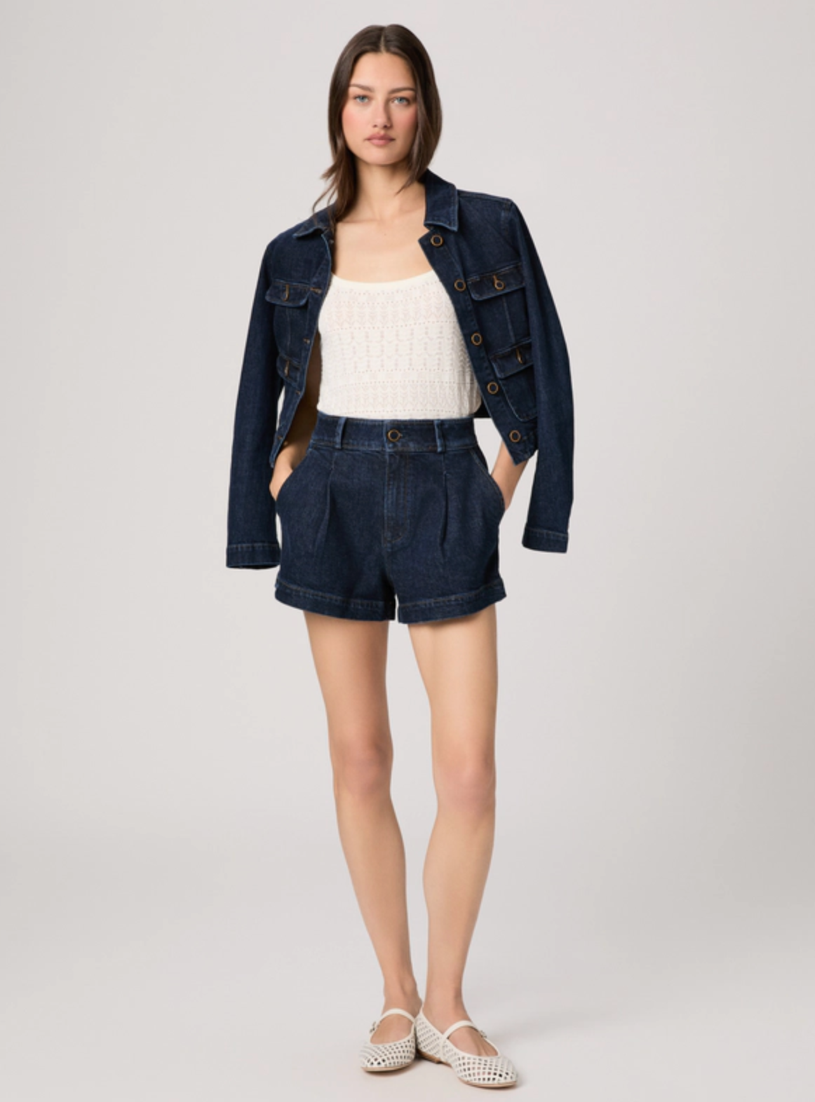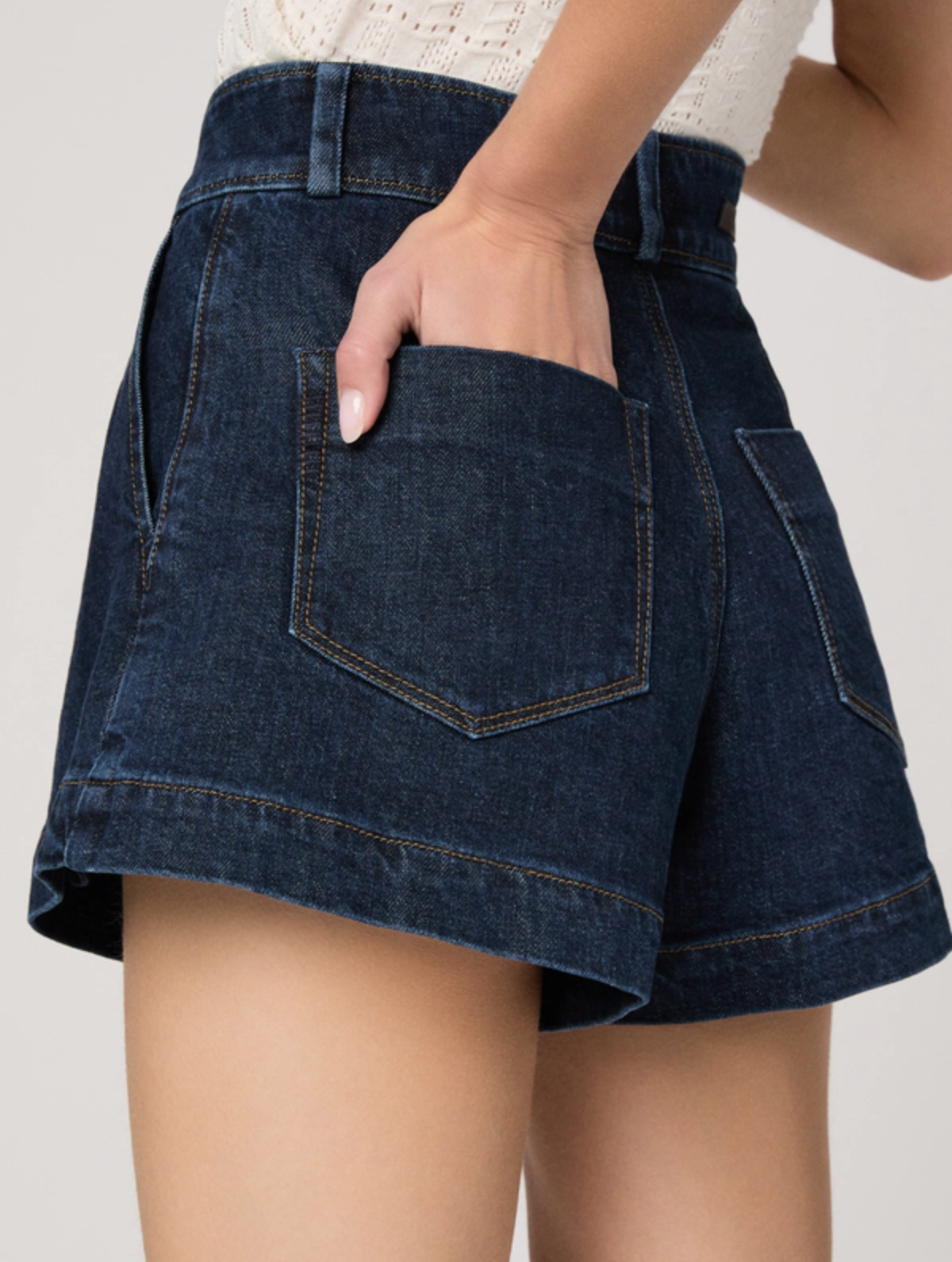Camille is a high-rise dressed up denim short with a 3” inseam. In an elevated dark indigo wash with a self-covered vintage gold trim button, this pair is crafted from heritage-inspired denim with a soft hand-feel and a hint of stretch. Pair them with the matching Lydia Jacket for a chic double denim moment.