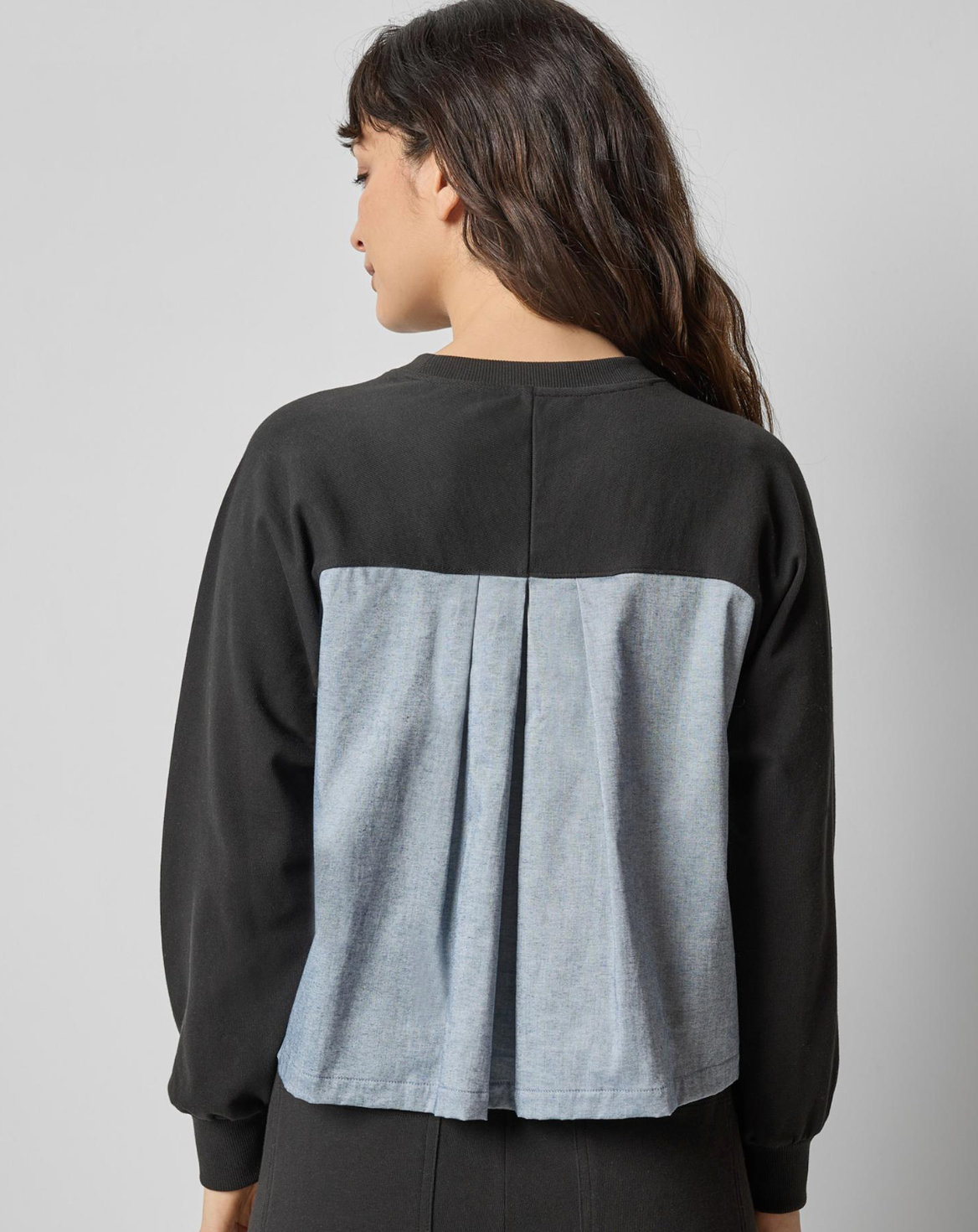 Elevate your everyday wardrobe with this sophisticated chambray pullover, designed with a striking pleat back detail that adds dimension and visual interest. The relaxed pullover silhouette offers effortless comfort, while the structured pleating creates a polished, intentional look perfect for layering or wearing solo. Crafted in classic black chambray, this versatile piece transitions seamlessly from casual weekends to professional settings, making it an essential addition to any closet.