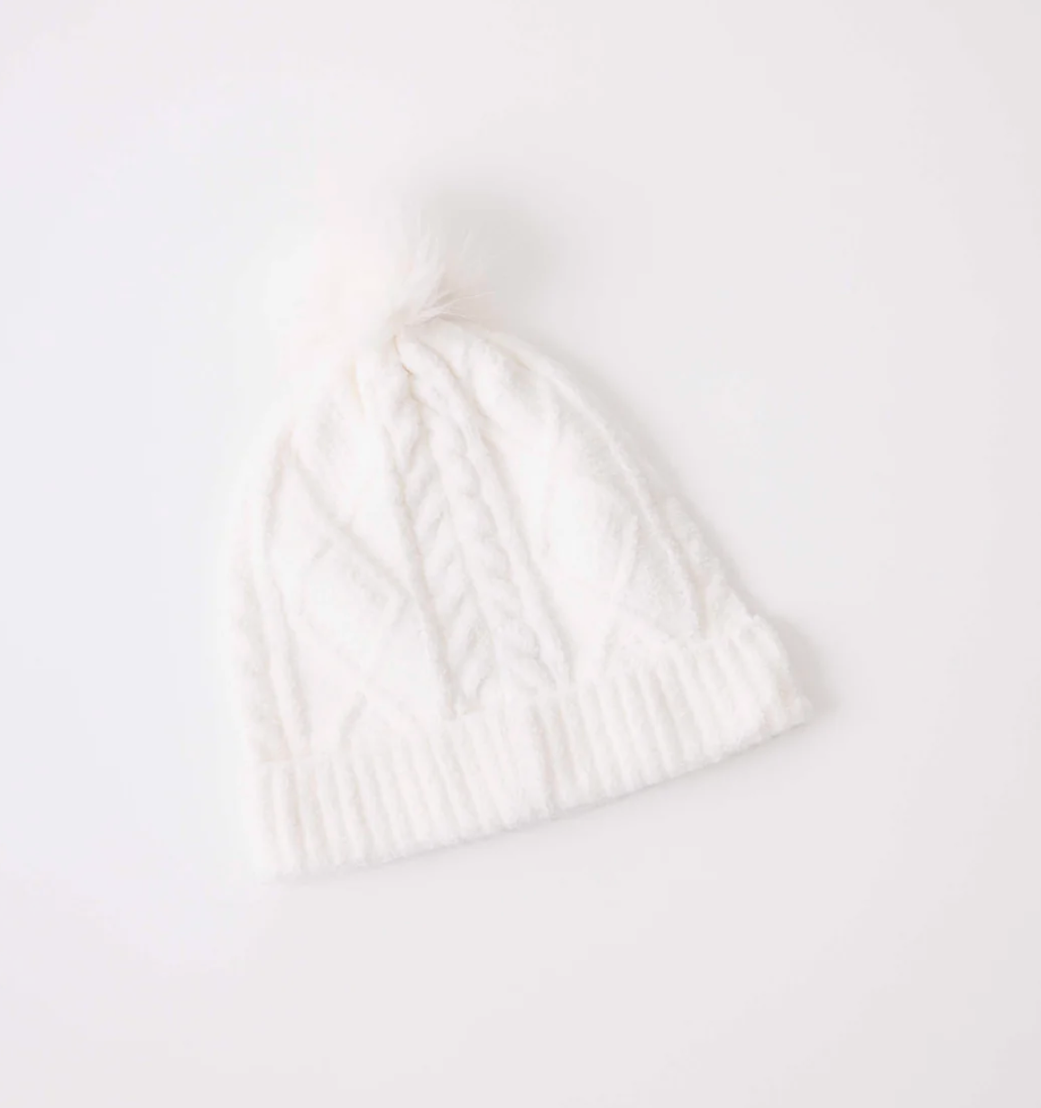 Women's chenille cable knit beanie in luxurious ivory that combines softness with timeless style. The distinctive cable knit pattern adds visual interest and dimension, while the ribbed cuff ensures a secure, comfortable fit that stays in place all day. Topped with a plush faux-fur pom that catches the light beautifully, this beanie elevates any winter look from casual to chic. Crafted from 100% polyester, it's easy to care for and maintains its shape season after season. Perfect for keeping warm without compromising on style, this versatile beanie pairs effortlessly with coats, scarves, and winter accessories. Whether you're heading to the slopes or running errands around town, this cozy essential delivers both comfort and sophistication.