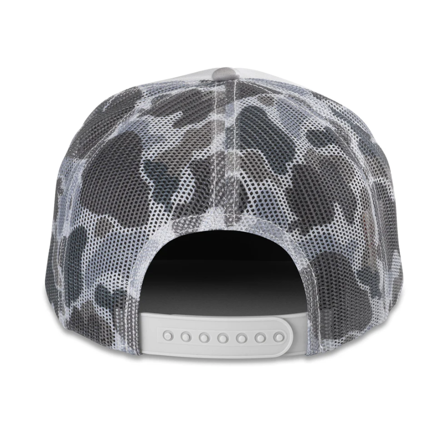 5 panel soft foamy crown. Printed camo visor, mesh sides and mesh back paneling. Curved brim, thin braided nylon rope across visor and adjustable plastic snapback. Front logo is woven label merrowed patch.