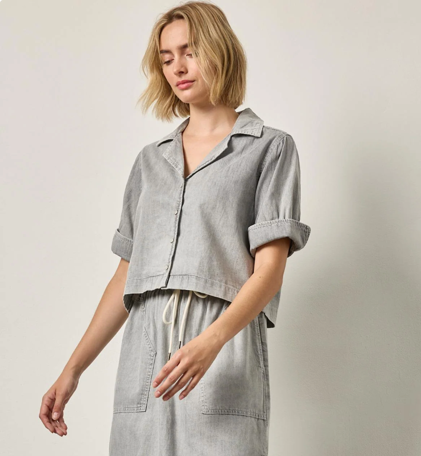 Our Denim Cuffed Shirt adds a chic twist to everyday denim. Designed in our lightweight 100% cotton denim, this style has elbow-length sleeves with subtle shirring and fullness above the cuff for a feminine touch. Pearlized rim snap buttons lend a hint of western flair, while the slightly shorter body length makes it the perfect match for our coordinating denim bottoms. Whether styled with matching separates or your favorite pieces, this is a fresh take on the classic denim shirt.