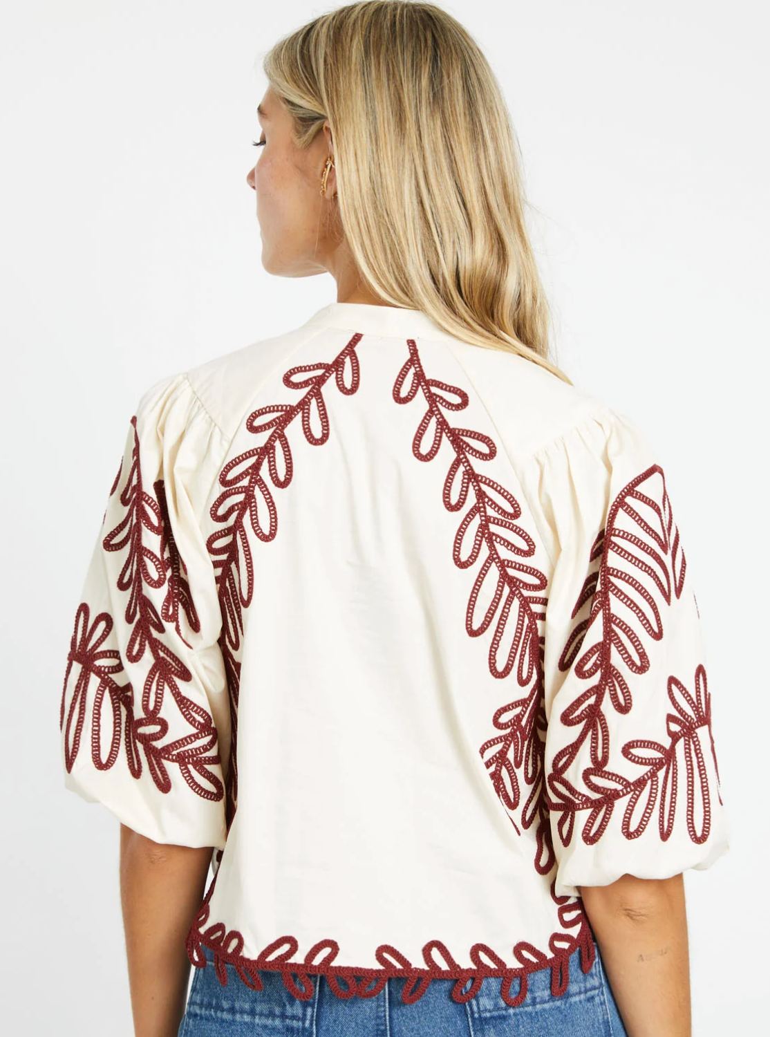 The Elodie Top in Ivory cotton twill showcases intricate chocolate-hued leafy embroidery, creating a striking and organic design. Thoughtfully placed along the body, as well as across the voluminous puff sleeves, the embroidery adds texture and artisanal detail. A subtle stand collar with a front slit and loop closure complements the relaxed, slightly boxy silhouette for an easy yet elevated fit.