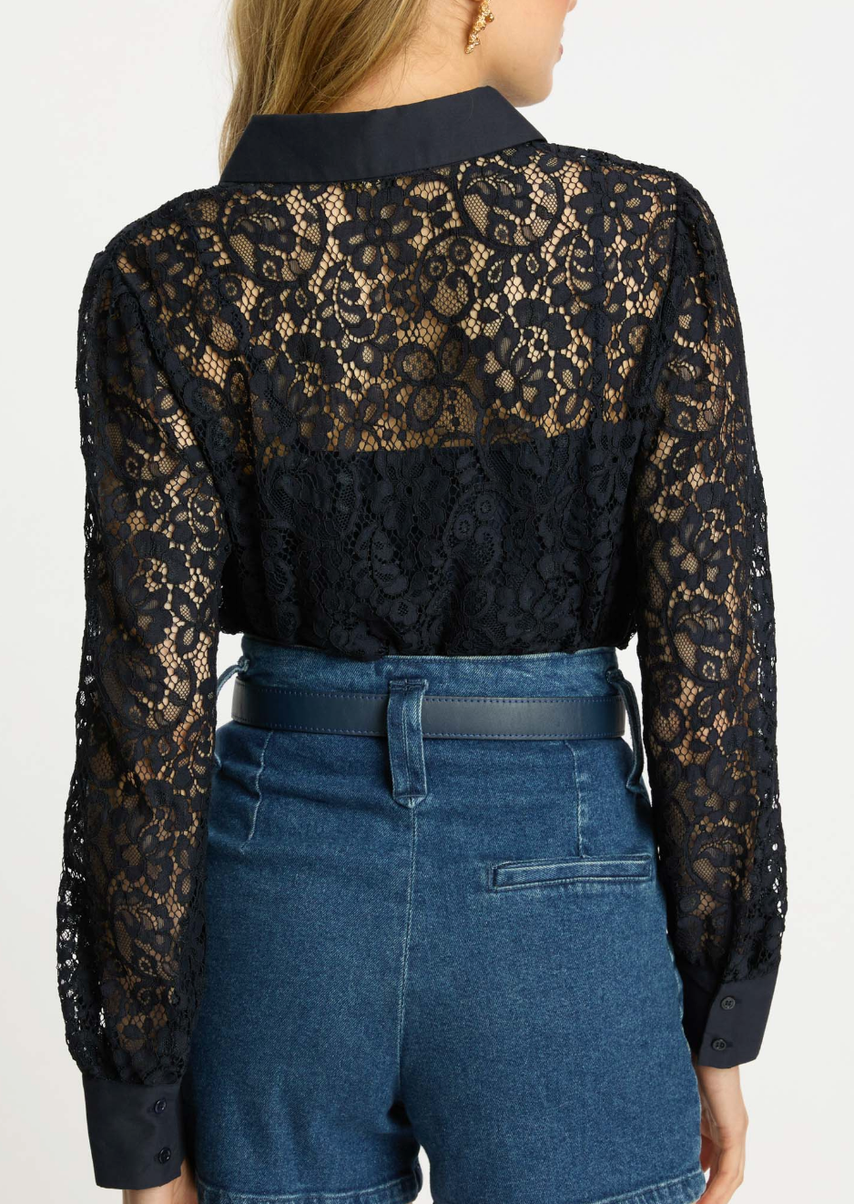 The Emmie Top in Dark Navy Lace exudes sophistication and romance with its intricate lace design and deep, rich hue. Featuring a classic shirt collar and button-down front, it blends timeless elegance with a touch of modern refinement. Sheer lace sleeves and a scalloped hem add delicate detailing, creating a look that’s effortlessly elevated.