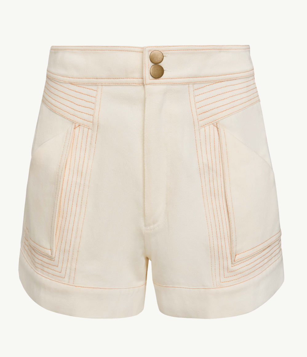 The Essie Short in cream is a polished warm-weather staple with a clean, structured feel. Designed with a high-waisted silhouette, it features a double-button front closure and crisp seam detailing that adds subtle dimension. Oversized front patch pockets lend a modern, utility-inspired touch while keeping the look refined.