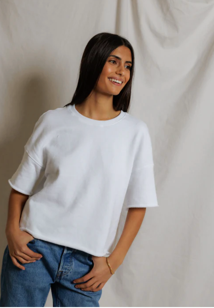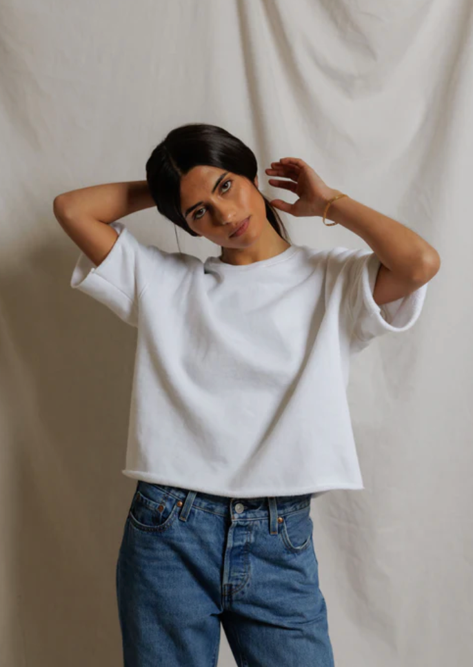 the ezra is made from our soft french terry, cut into a boxy, short-sleeve silhouette with drop shoulders. it’s structured enough to style up, but comfy enough to throw on with anything. part tee, part pullover, and 100% easy.