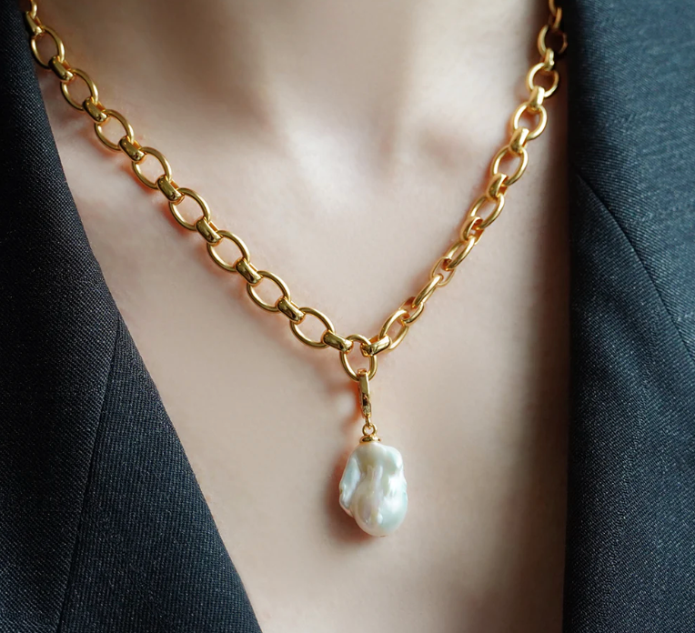 Make a statement with a chunky chain adorned with a bold, Baroque-inspired freshwater pearl. Bonus: You can move the pendant to any link you like, and even wear it as a lariat with the pearl below the toggle-style clasp.
