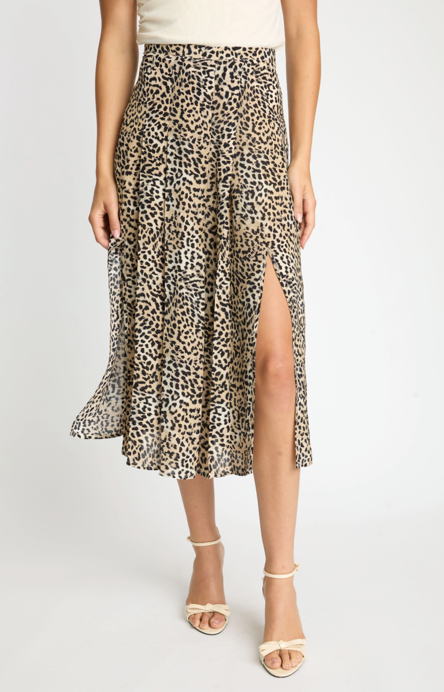 Designed with a flattering high-rise waist and a soft, flowing drape, the Glenda Skirt is finished with a 2 front slits that adds movement and subtle allure. Easy to dress up or down, it pairs beautifully with simple knits, tucked-in blouses, or matching Golden Leopard pieces for a coordinated look.