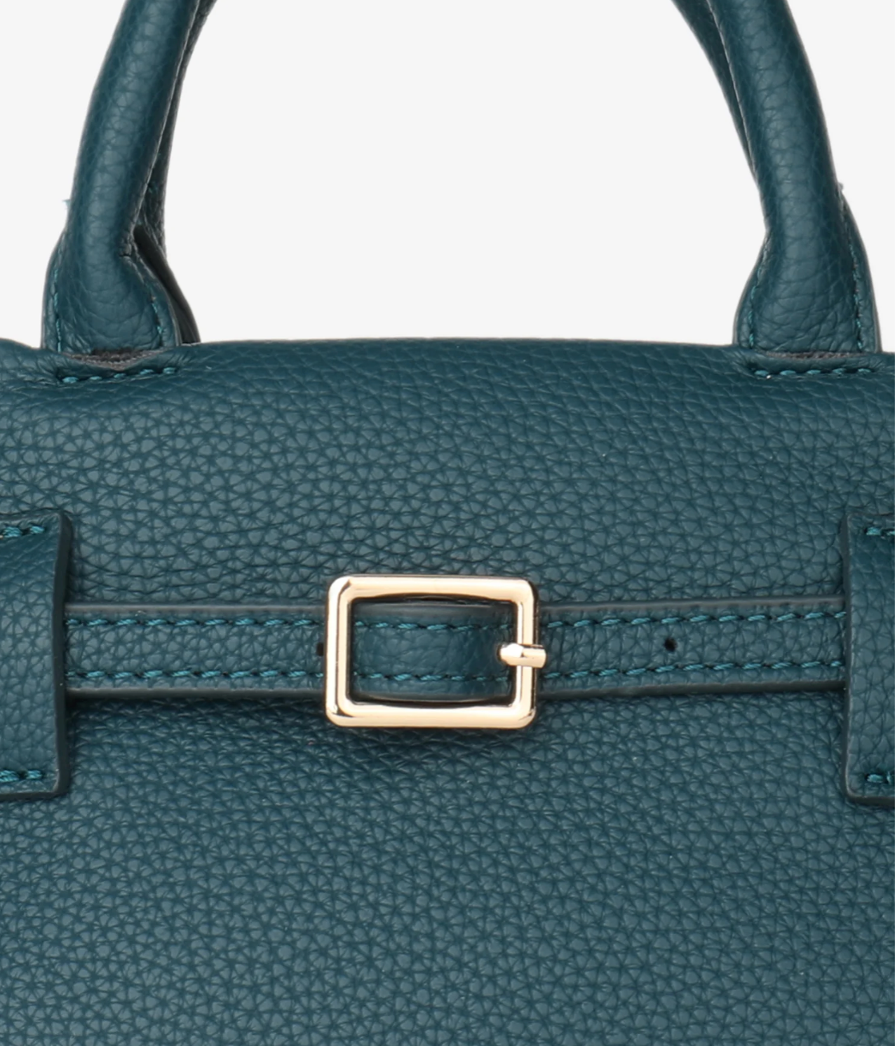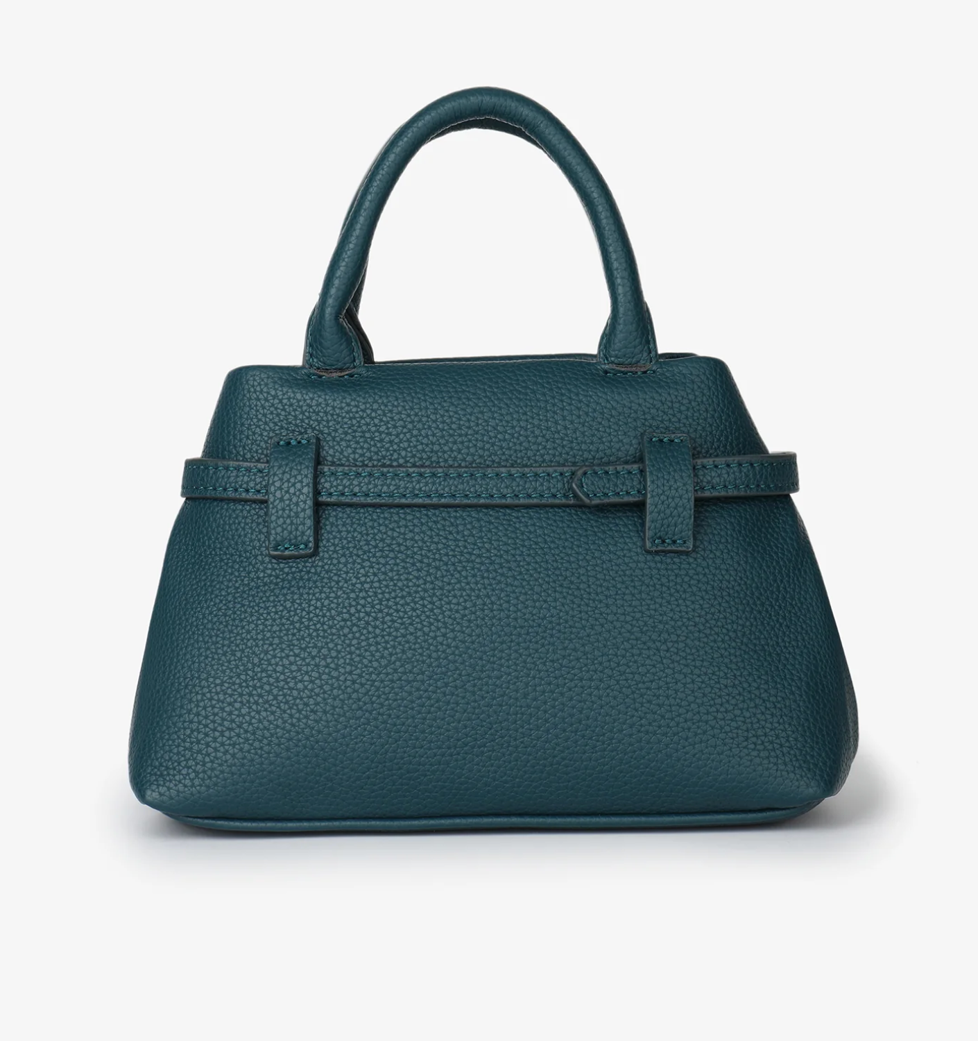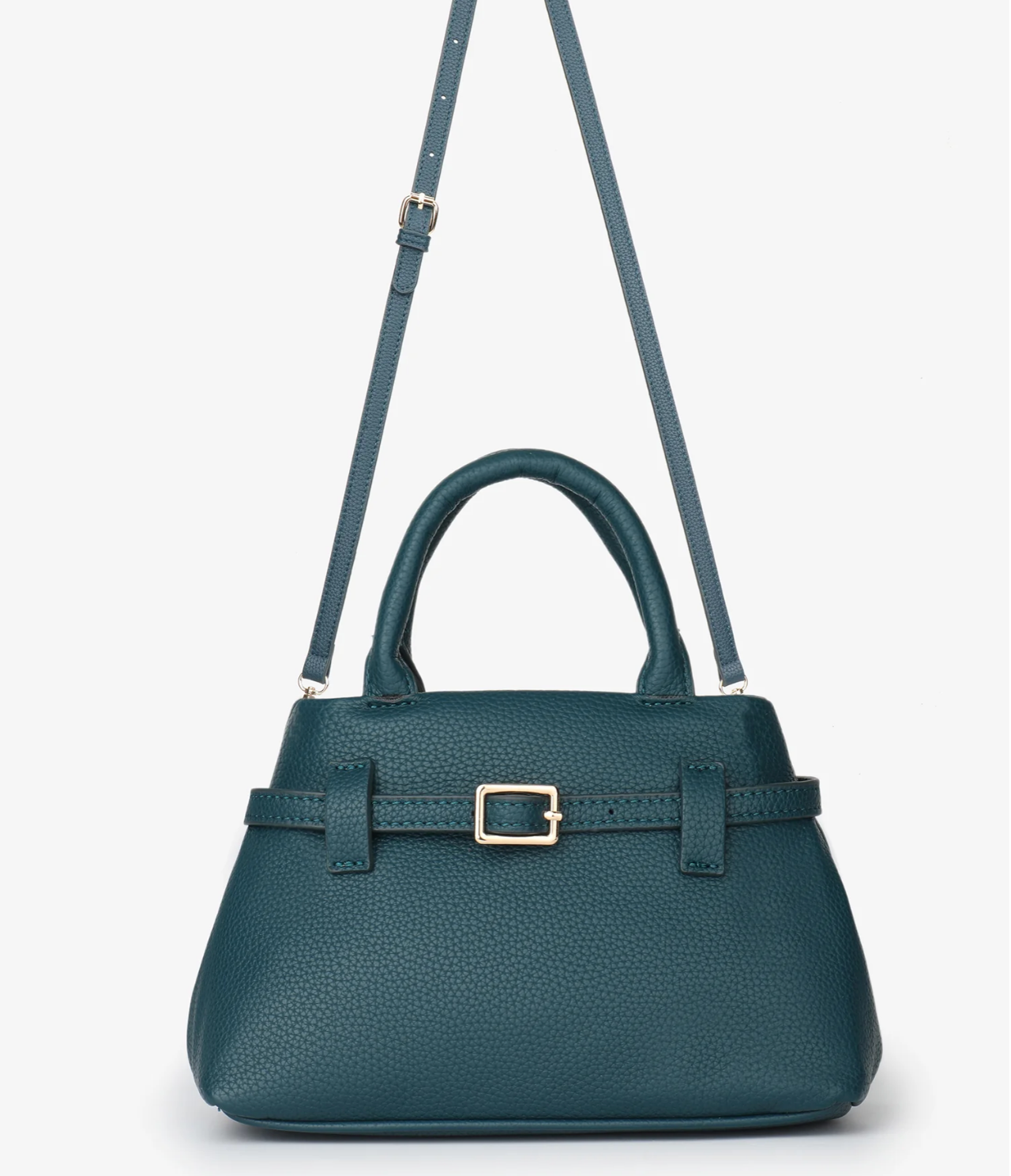 A structured, timeless satchel made from premium, richly textured vegan leather. It features classic top handles, a sleek adjustable crossbody strap, and striking gold-tone buckle hardware. A sophisticated and essential mini accessory for conscious style.