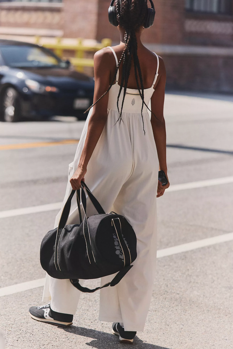 Features: Pull-on silhouette; slightly fitted, square-neck bodice; adjustable, spaghetti-style straps; pleated detailing at empire waist; slouchy patch pockets; oversized, wide legs; zipped logo pocket at back.