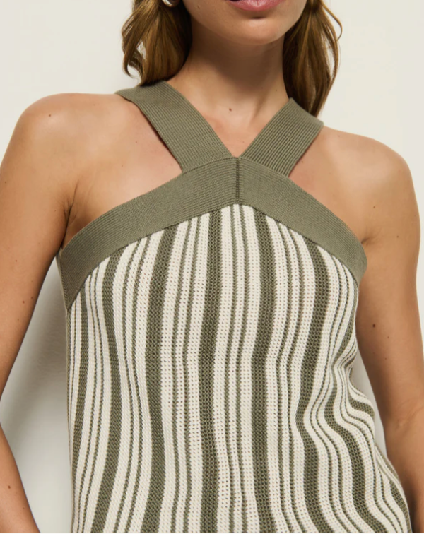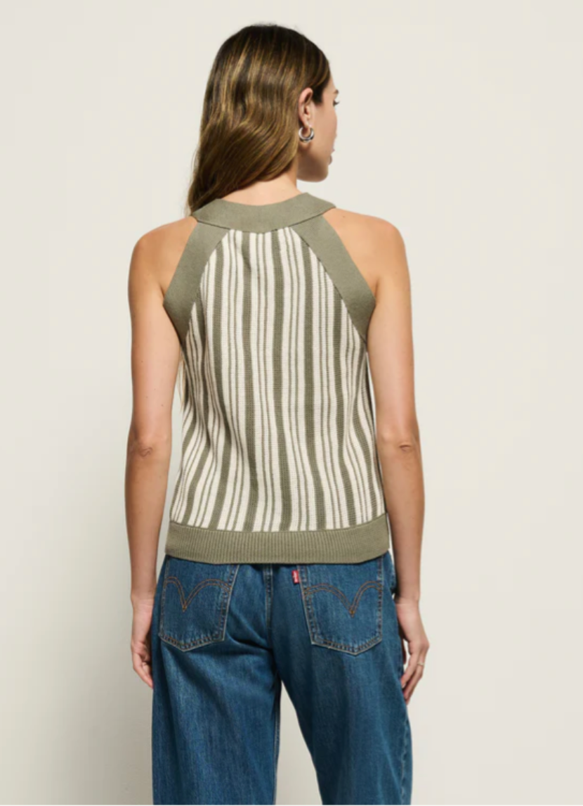 A playful upgrade to your warm weather halter, the Indy Top is your polished-meets-flirty essential. Featuring a colorblocked bodice, this sweater tank showcases a ribbed knit fabric and banded v-neckline. This one comes in Herb Stripe.