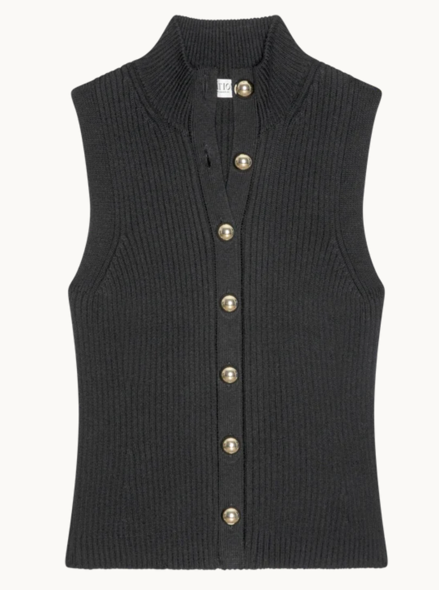 This timeless cotton cashmere sweater vest hits right at the hip and includes details like a mock neck, luxe ribbing, and gold dome buttons.