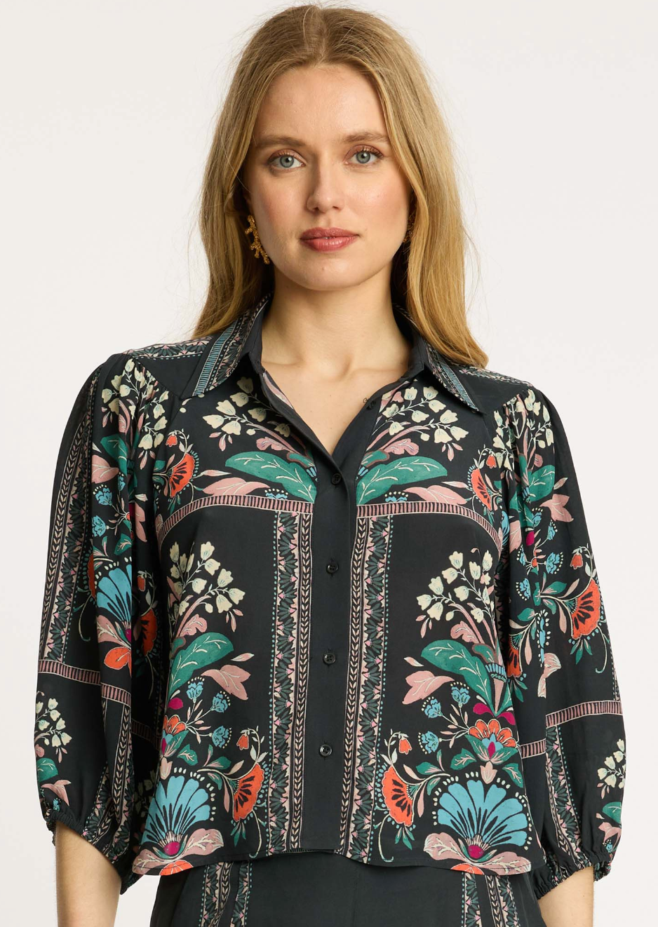 The Twilight Bloom print—an enchanting mix of teal, coral, and ivory florals set against a deep charcoal base—adds a sense of artistry and depth. Pair it with tailored trousers or denim for an elevated yet easy look.