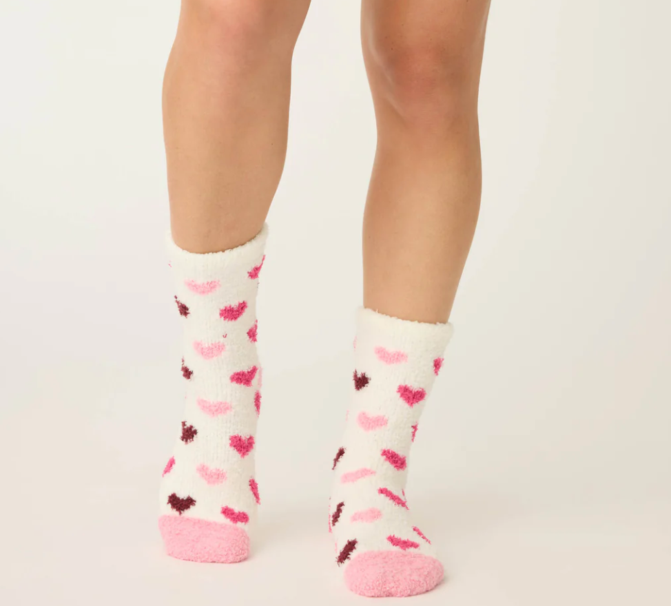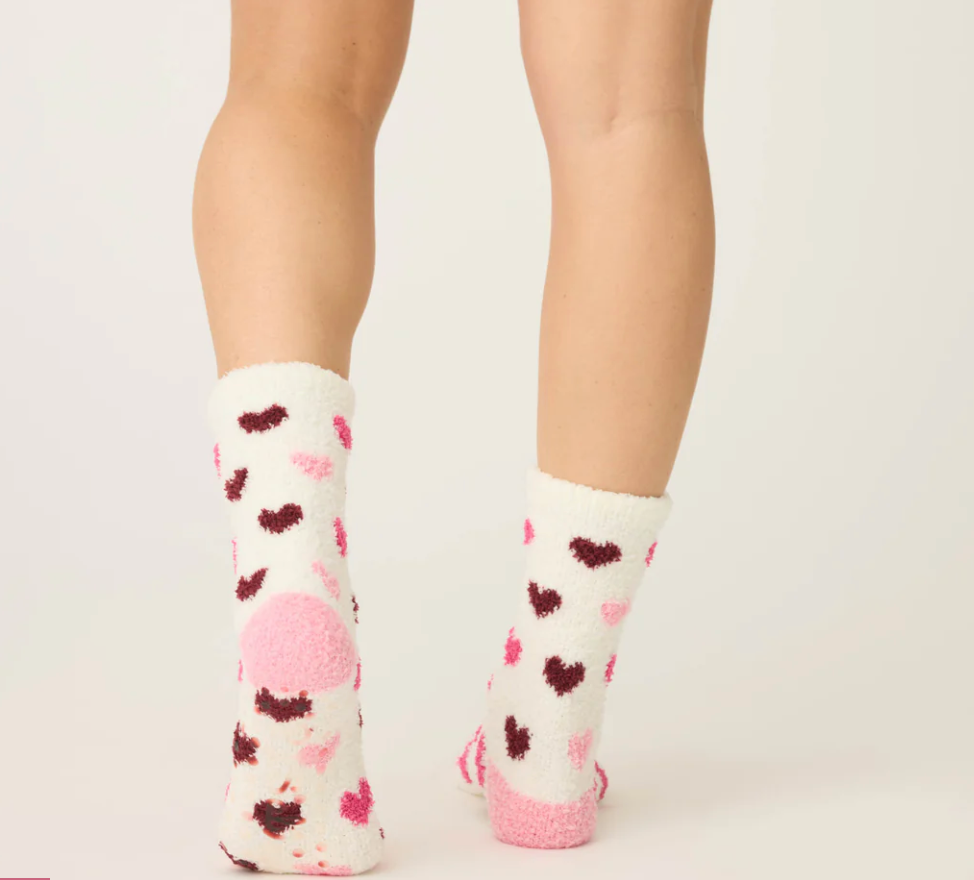 For anyone with a soft spot (or just cold feet). These fuzzy gripper socks feature a heart print and candy-pink accents—made for cozy nights and cute moments alike.