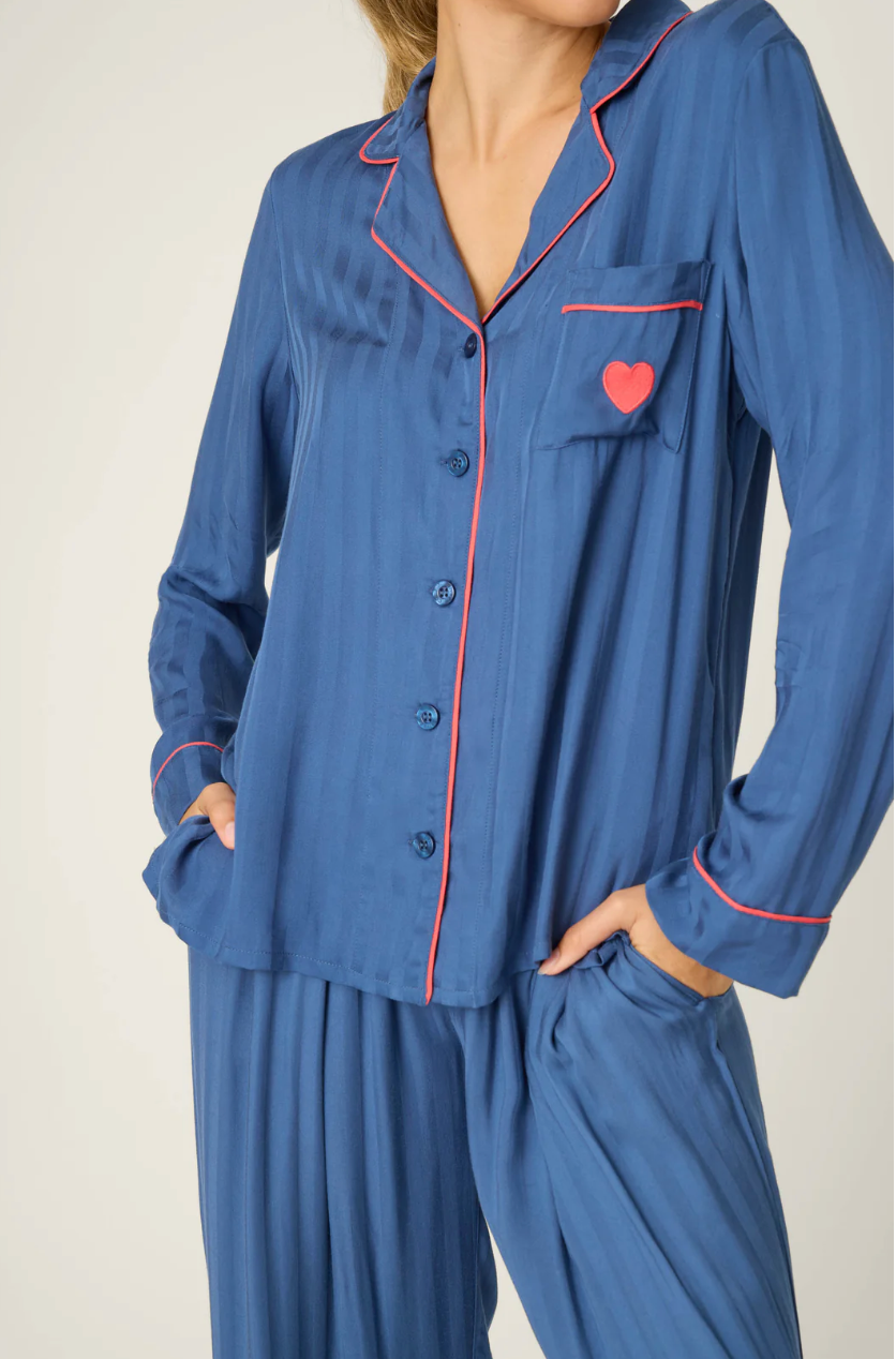 A true bedtime classic with a modern twist. This pajama pant—crafted from jacquard sateen—pairs a tonal-striped, contrast-piped button-down with full-length pants for an iconically coordinated look. Heart embroidery at the pocket makes it even sweeter, no matter the hour.