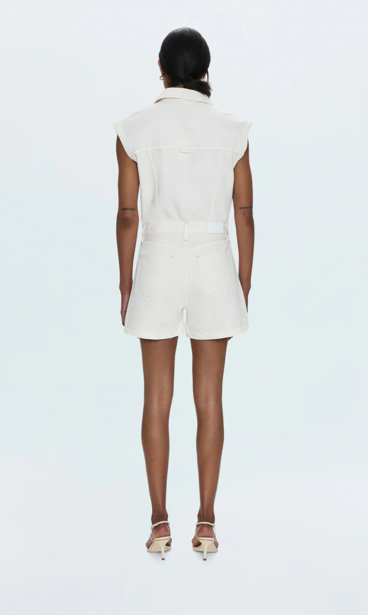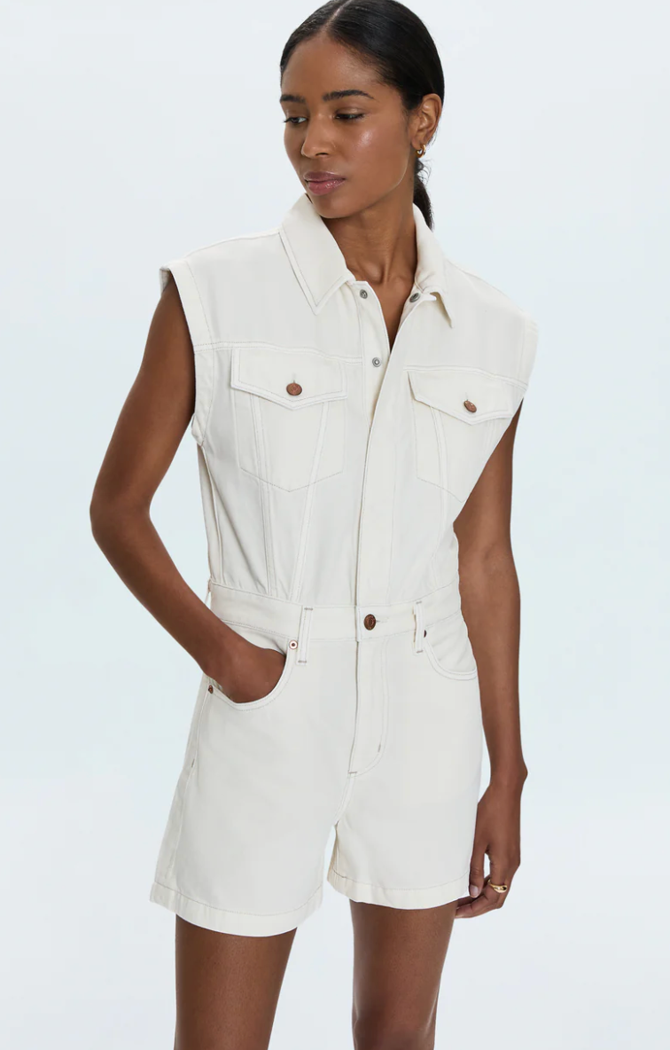 Jaunty denim romper with a collared neckline and princess cut short sleeves, that falls into a relaxed fit A-line short silhouette.