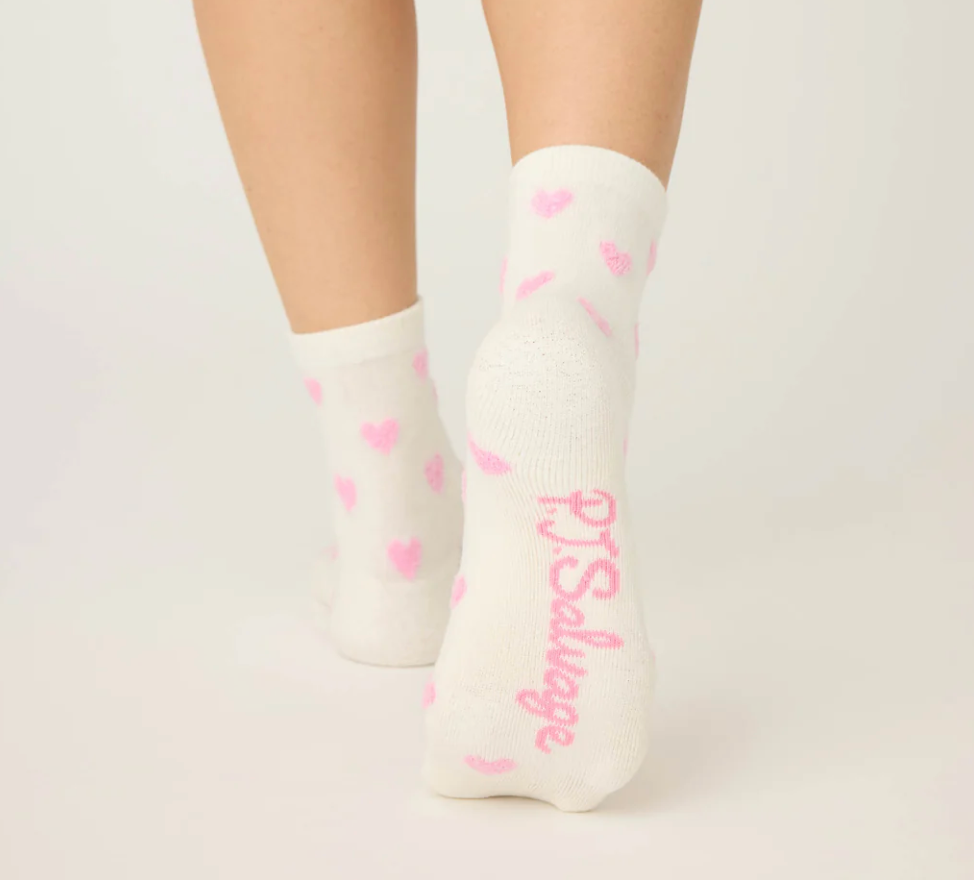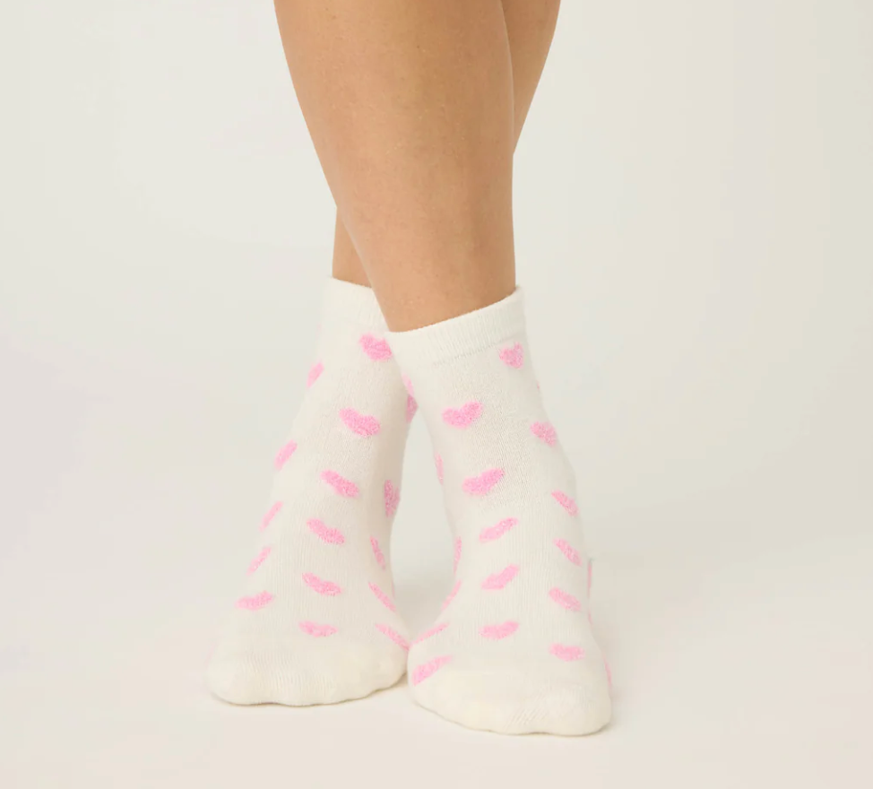 Love, actually—in sock form. These ivory crew socks are sprinkled with pink hearts and crafted in a fuzzy-soft knit that hits just above the ankle. Gripper soles keep every step grounded, whether you're curling up or cruising for snacks.