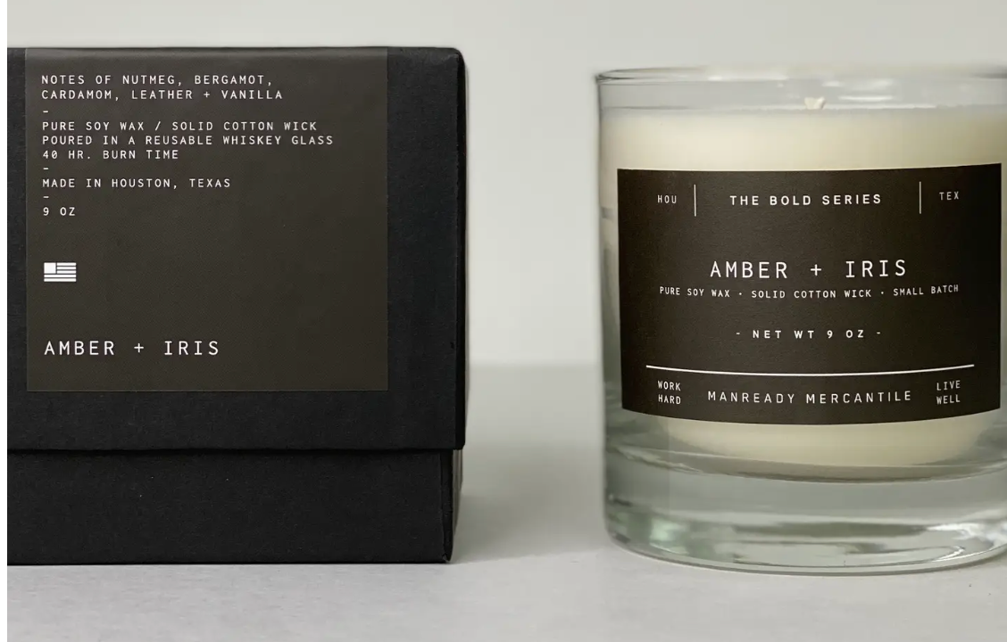 Manready Mercantile candles are made from a special blend of custom, high-end fragrance oils, 100% soy wax, cotton wick, and as always a reusable whiskey glass housed in a custom US made box. Glass and box labels designed by Joshua Minnich. Locally made in Houston!