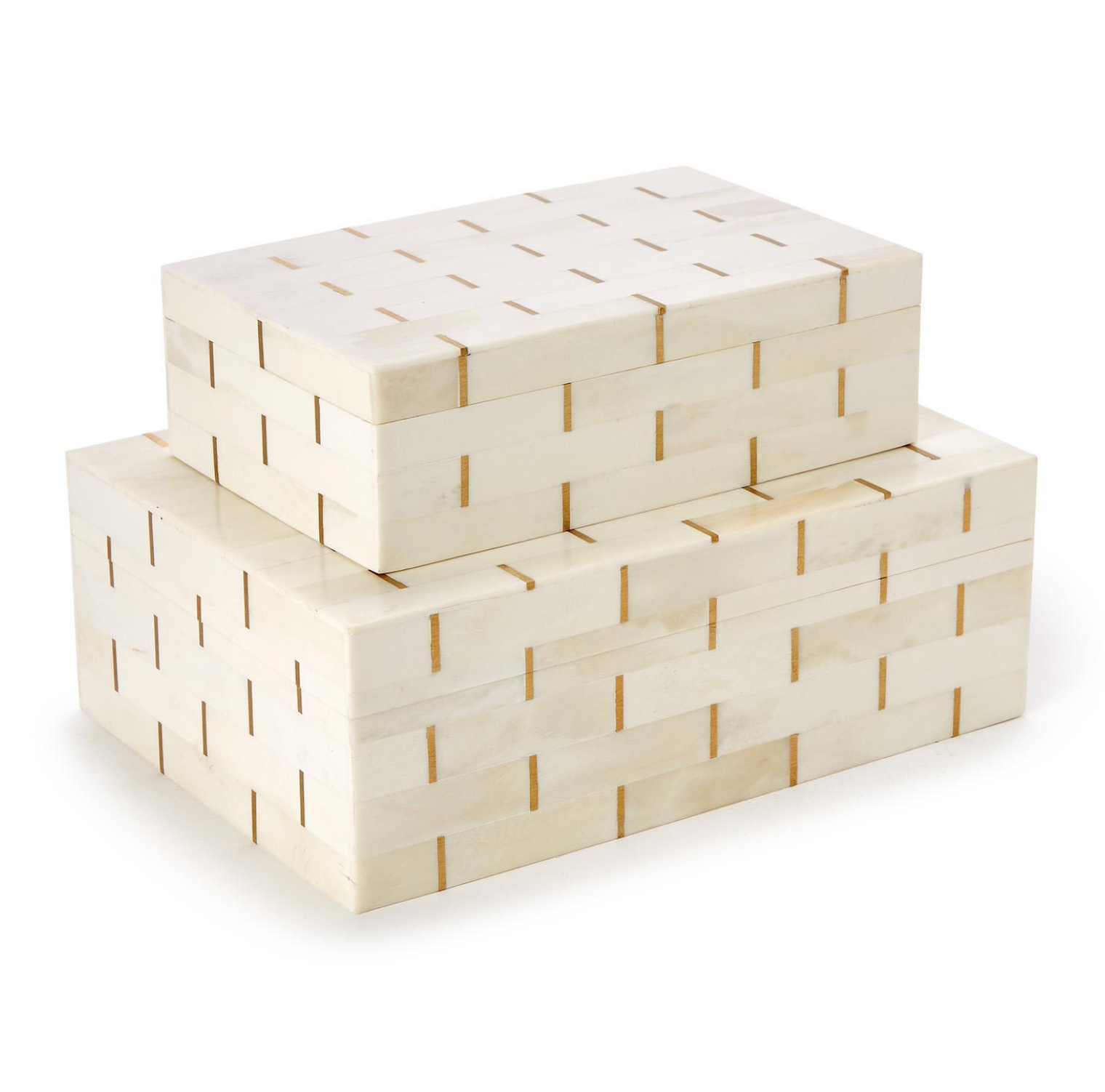 Immerse your space in sophistication with our Vendome Set of 2 Covered Boxes. Crafted from bone, MDF, and brass, these exquisite boxes are both luxurious and functional. The handcrafted detailing adds a touch of elegance to any room, perfect for storing TV remotes, trinkets or jewelry.