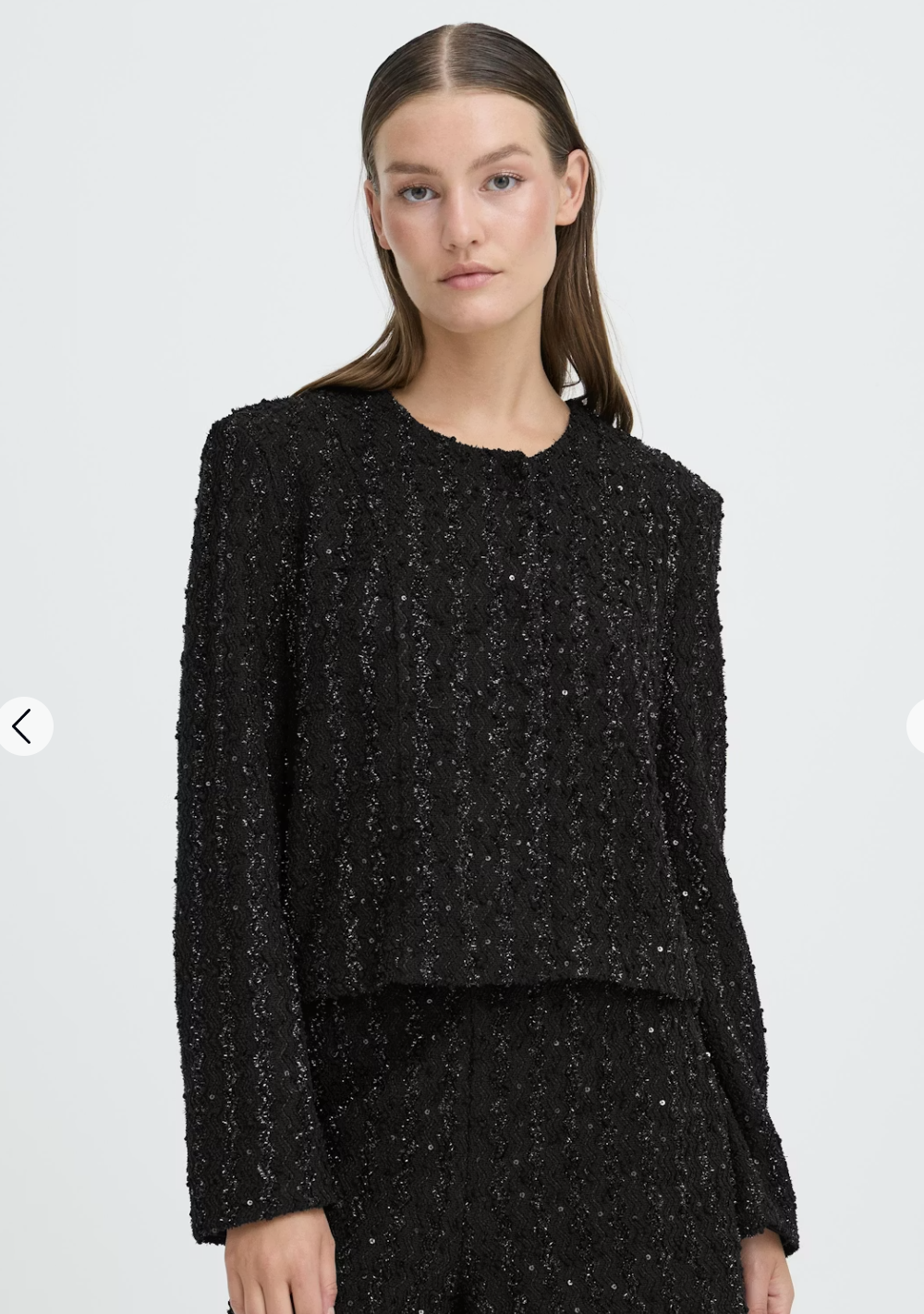 Cropped sequin jacket with a straight silhouette, textured finish, and long sleeves. Features a clean round neckline and subtle sparkle throughout the style.