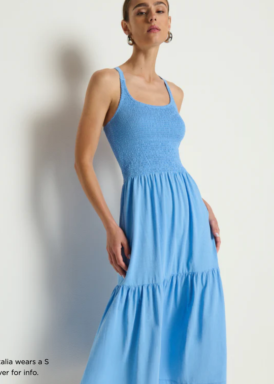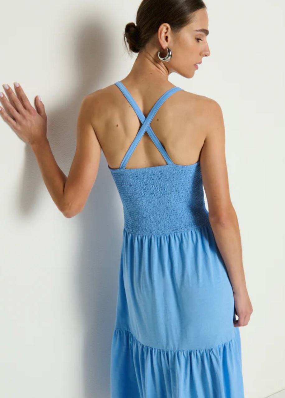 Made to flatter with a smocked bodice, crossed back straps, and a single tiered skirt, this effortless midi dress is sure to make you an outfit repeater.