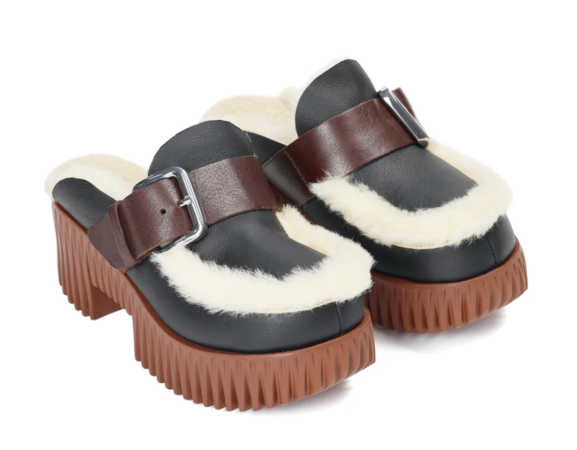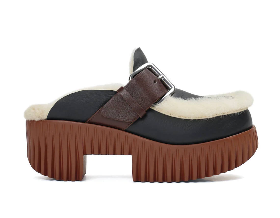 Carved from foam rubber to mimic natural textures like dandelion heads and mushroom gills, PLIA embodies buoyancy and lightness. Inspired by traditional chunky wooden clogs, the base of the shoe combines flexible, modern materials with a voluminous silhouette. Not only incredibly coy. Plia Amber has platform soles that make it feel so effortlessly cool. It is made from warm sheep shearling and detailed with metal buckle for an ideal fit.