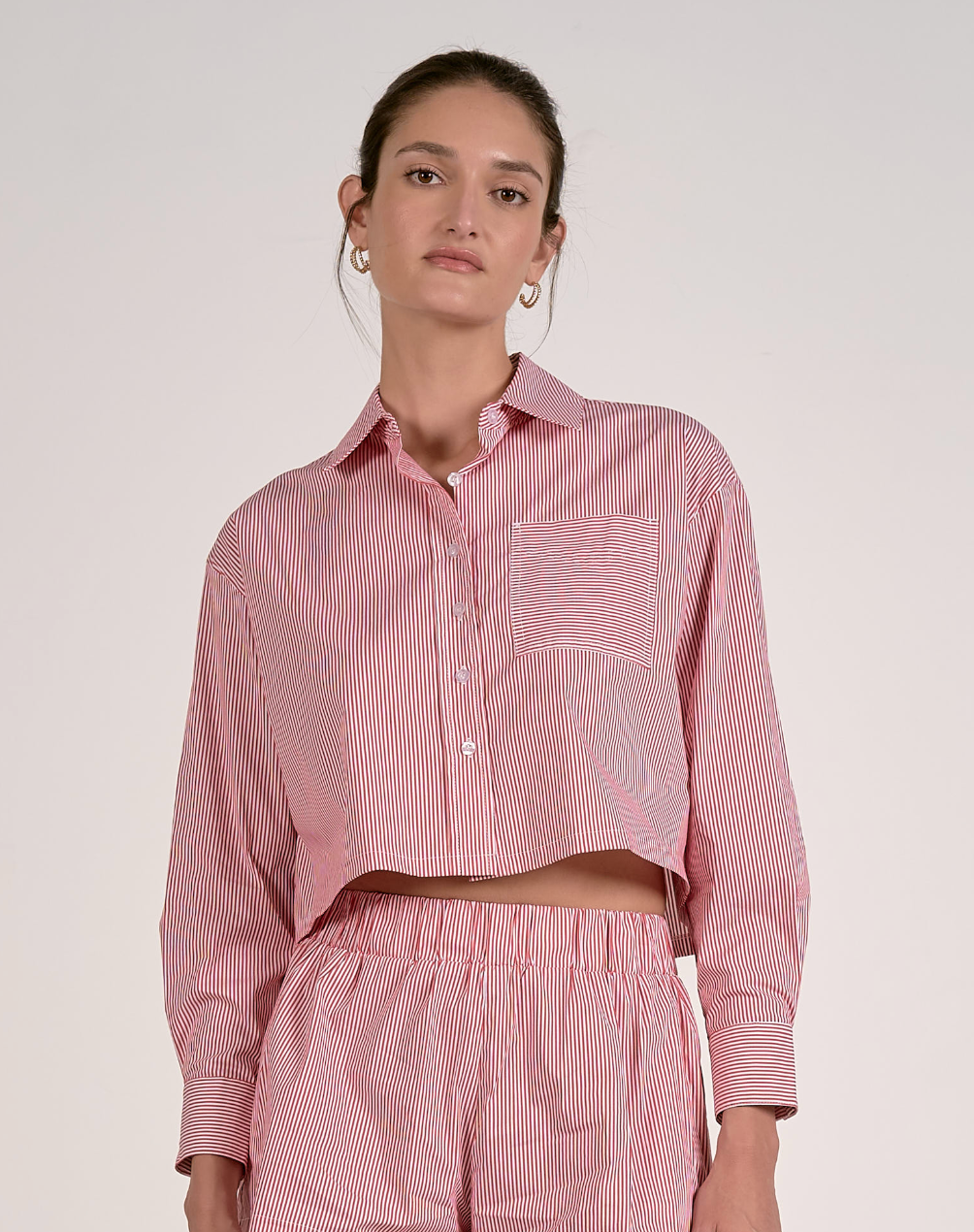 Elevate your everyday wardrobe with this timeless red stripe button down. Perfect for casual outings or polished office days, its classic design pairs effortlessly with jeans, skirts, or tailored trousers. The crisp stripes add visual interest while maintaining an understated elegance that works season after season. Whether you're dressing up or down, this versatile piece becomes an instant favorite—comfortable enough for all-day wear, stylish enough to turn heads. A wardrobe essential that delivers both sophistication and charm.