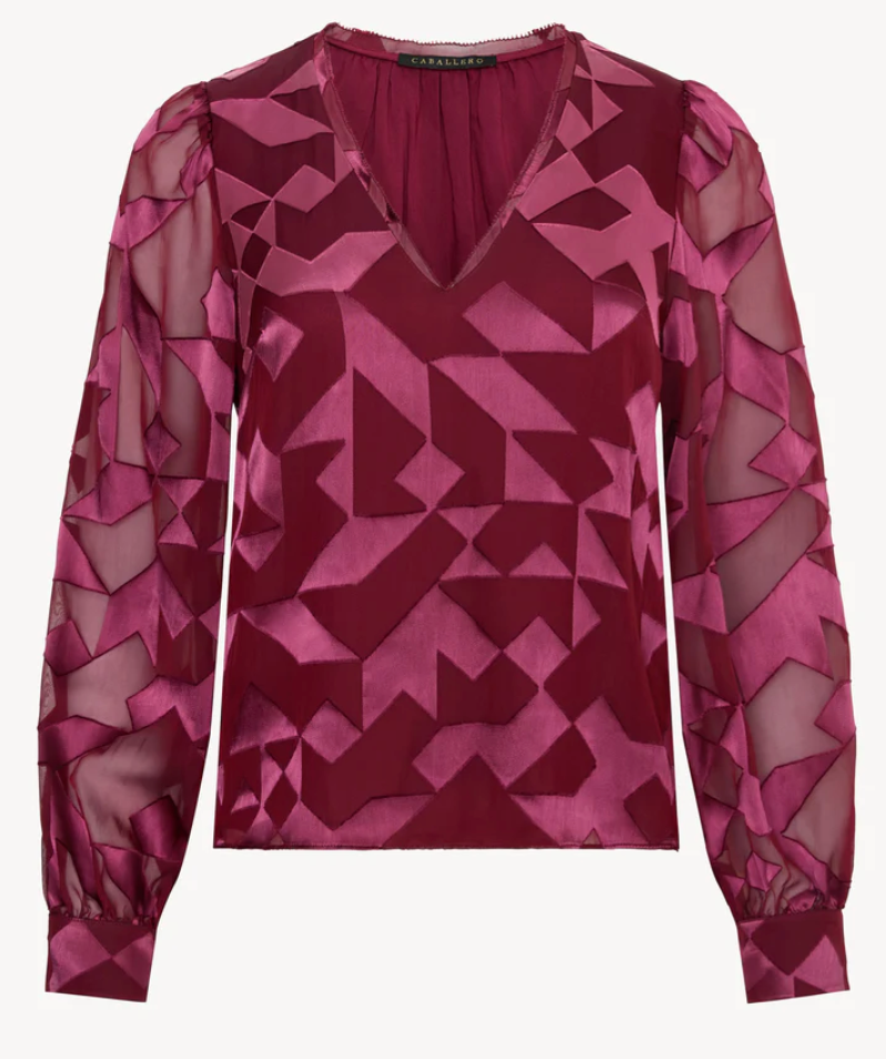 The Ruby Top is a long sleeve blouse crafted from a luxurious viscose-silk blend, adorned in our rich Cabernet Geometric Burnout print. The blouson sleeves are finished with buttoned cuffs, adding a subtle tailored detail to the flowing silhouette. A flattering V-neckline and gentle shirring at the back neck enhance the top’s relaxed, easy fit.