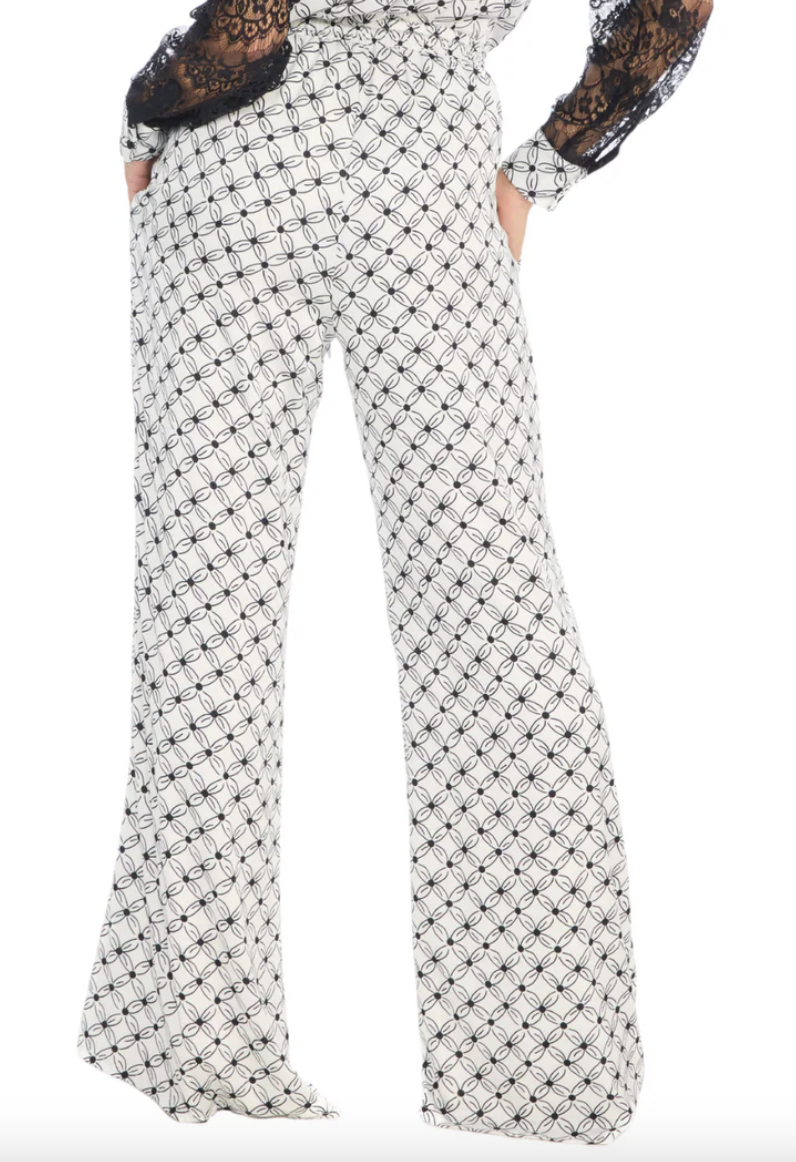Blending comfort and luxe; The Selena pants are cut from a slinky satin fabrication, offering a fluid and easy drape with an easy pull on elastic waist and chiffon drawstring tie with a wide opening at the bottom. Fully lined in a black and white tile print.