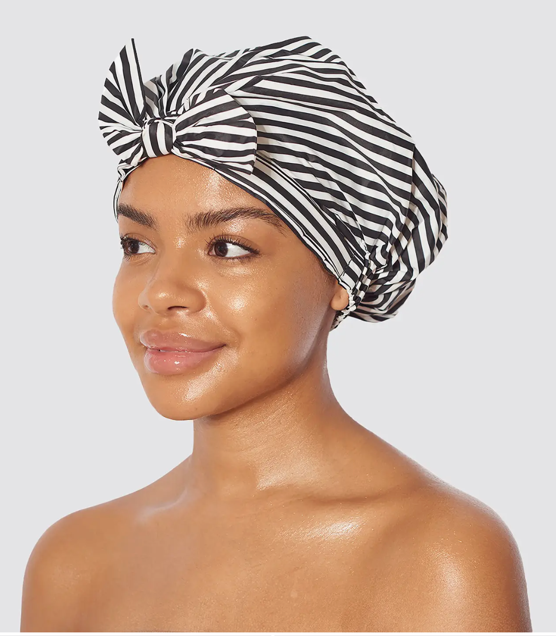 Our Luxe Shower Cap allows you to skip a wash day in style. We believe one should never have to sacrifice fashion for function. This is why our chic turban design is perfectly waterproof, comfortable to wear, lasts shower after shower, and beautiful! With elastic at the back and a no-slip silicone grip around the inside, this shower cap is sure to stay put. Benefits No-slip silicone grip Stylish design Waterproof and quick drying Comfortable to wear No skin indentations Multi-use for hair conditioning treatments Reusable travel pouch included
