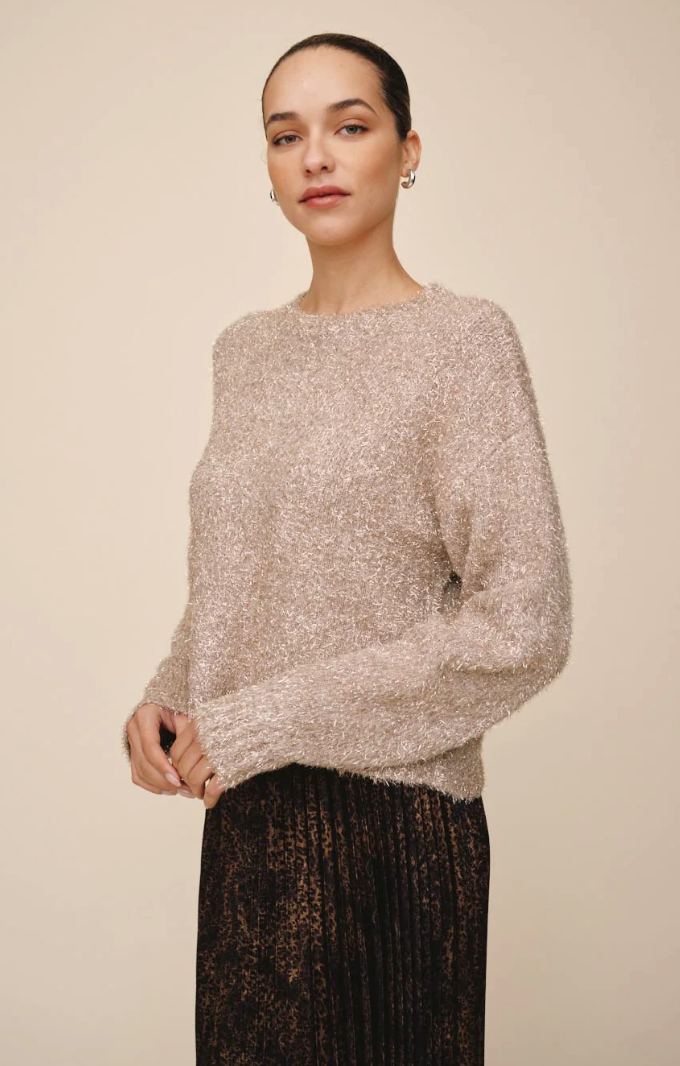 The Slouchy Sweater is a relaxed, cozy knit enhanced with subtle shimmer threads for a refined, luminous touch.