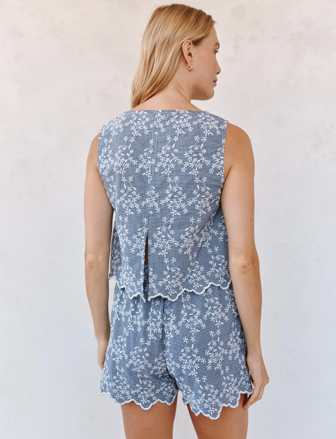 The Split Back Tank features a boxy silhouette with a high neckline, balanced by a split back detail that adds effortless movement and a thoughtful, feminine edge. The floral gingham print brings a garden-inspired freshness to a clean, contemporary shape.