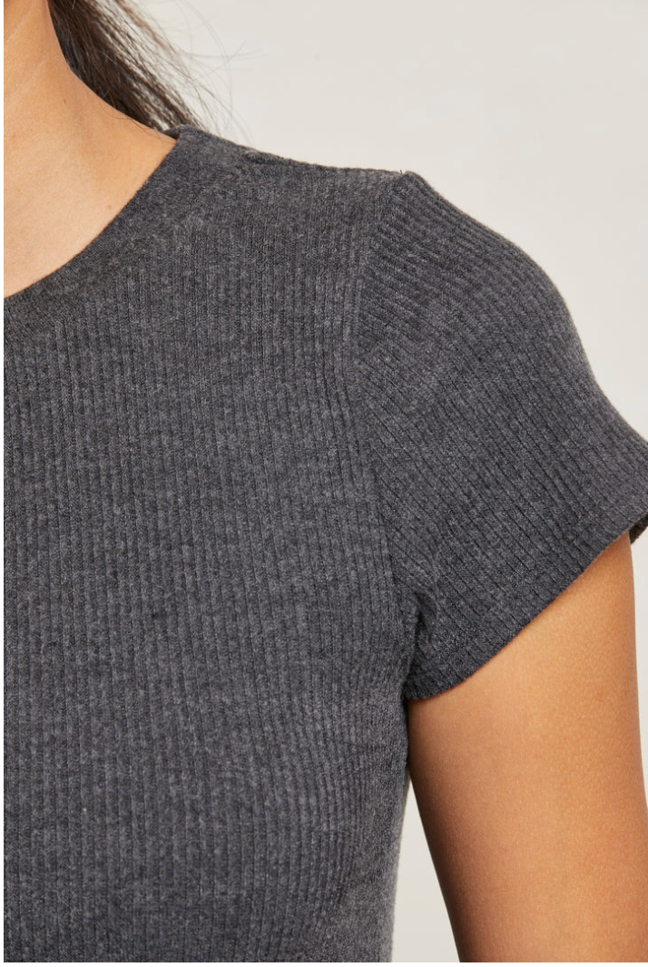 the gabby is your favorite baby tee—just grown up a bit. made in our signature soft sweater rib, she’s fitted through the body with short sleeves and a classic crew neckline. full-length and designed for that in-between-season sweet spot.