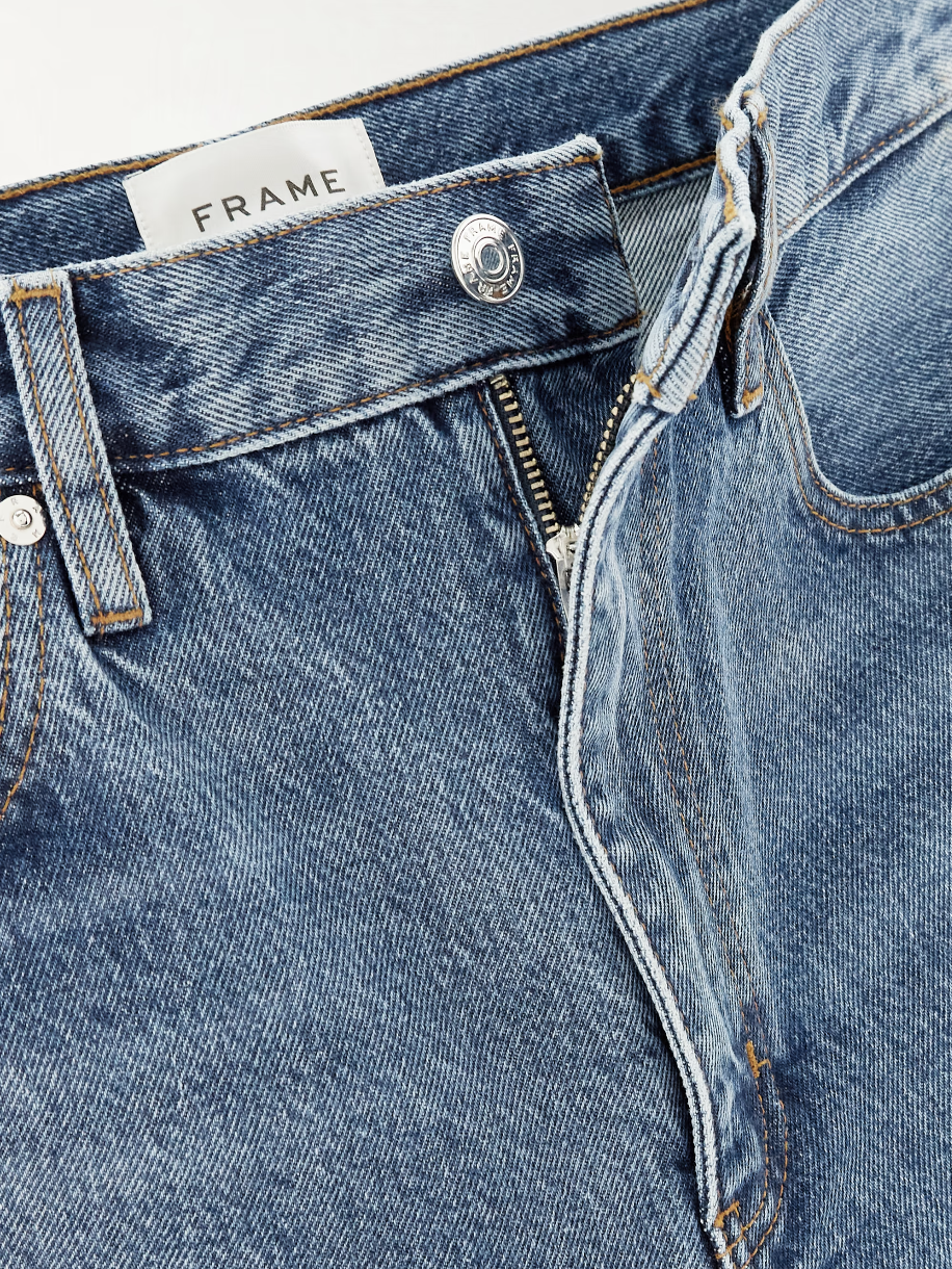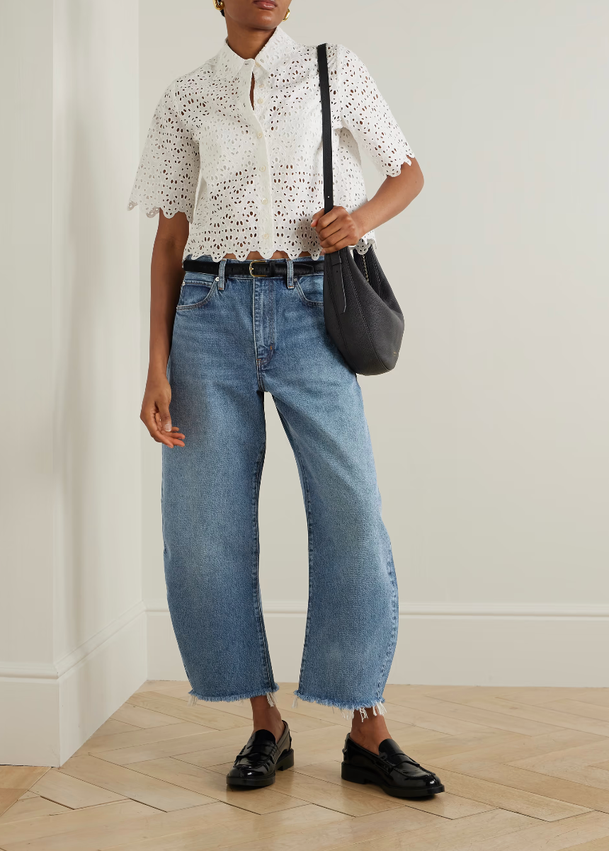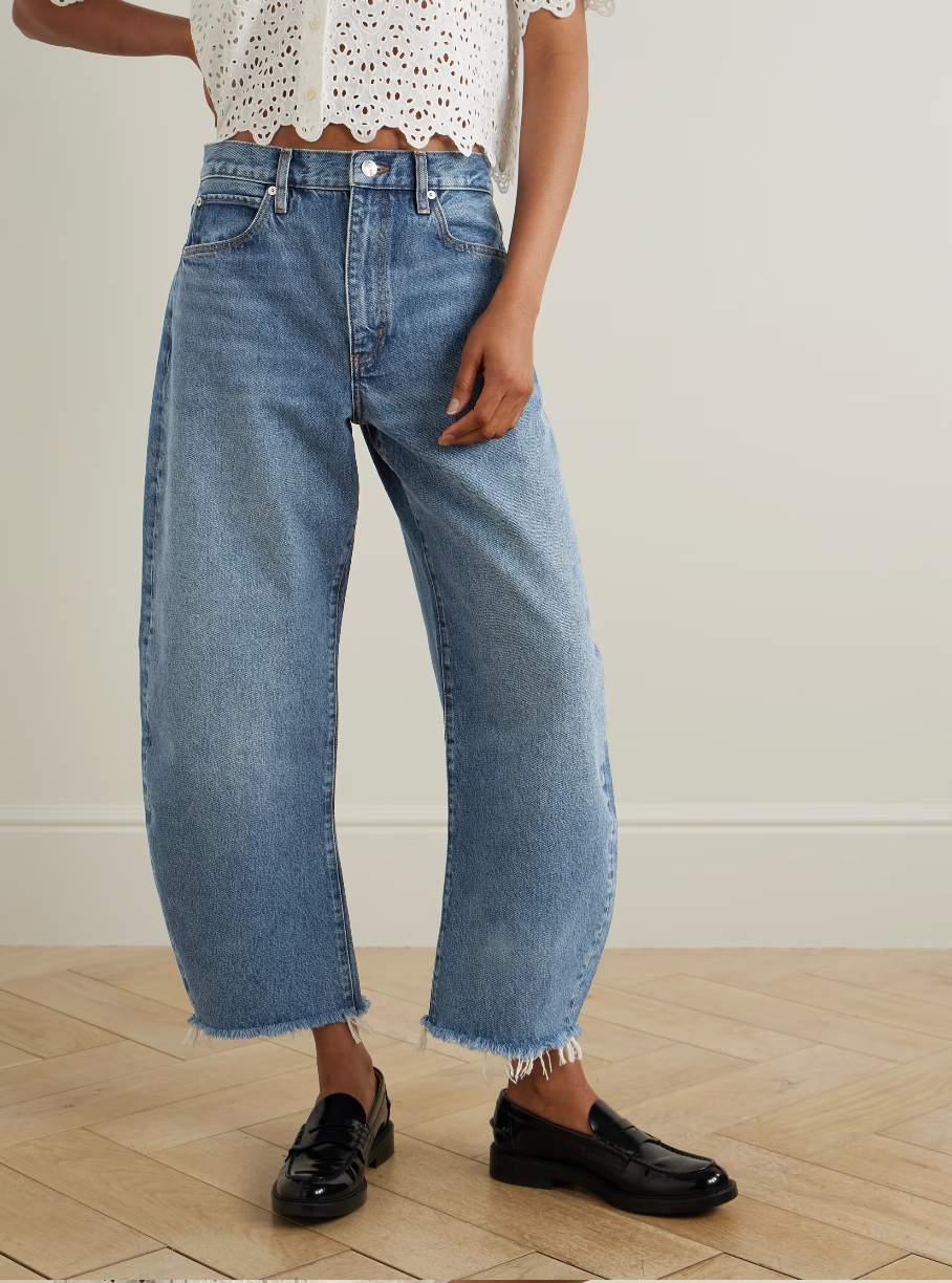 The best-selling Bubble, now with a shorter 27" inseam. The exaggerated take on the trending barrel silhouette is a unique fit and instant closet necessity. With a flattering high rise, these jeans have a curved outseam for a playful bubble effect. Note the light blue wash and raw, fringed hem for a pre-loved look.