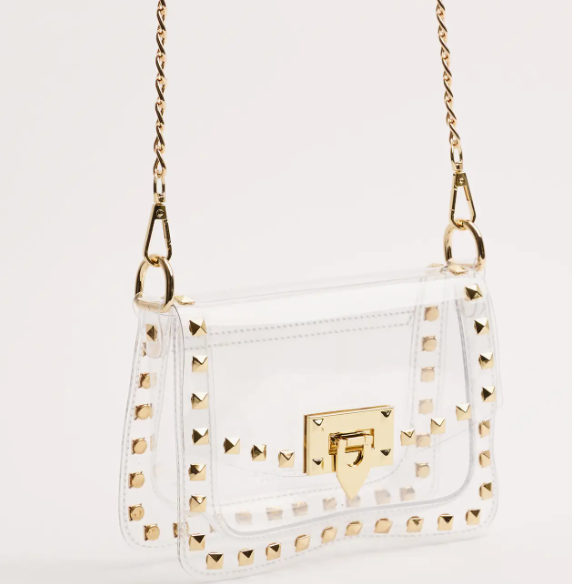 Score with the biggest winner in the clear handbag playbook - The Jackie! The Jackie changed the handbag game by proving clear handbags could be both functional and chic. This style includes gold square metal studs and a gold chain. The Jackie is NCAA and NFL-compliant and the ideal size to hold your wallet, phone, keys, lip gloss and a few other small items. DETAILS: • W 8" x H 6" x D 3" • Durable PVC • Gold Square Stud Accent • Gold-Plated Hardware and Chain