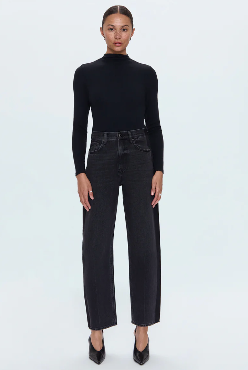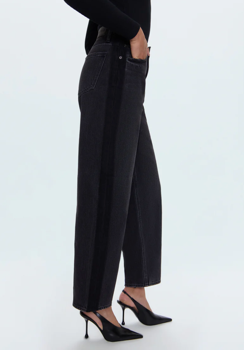 A best-selling silhouette, Wes offers a flattering high rise and full-length 30" inseam in a stylish barrel leg that delivers sophisticated drama. Clean hems and a tuxedo stripe detail refine the shape, while premium rigid non-stretch denim in Cinema, a rich black wash, adds effortless polish and versatility.