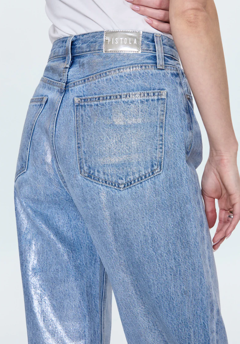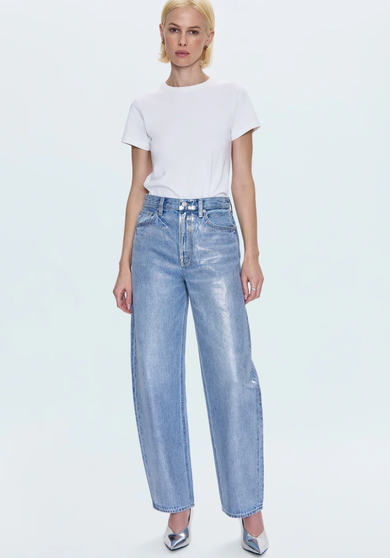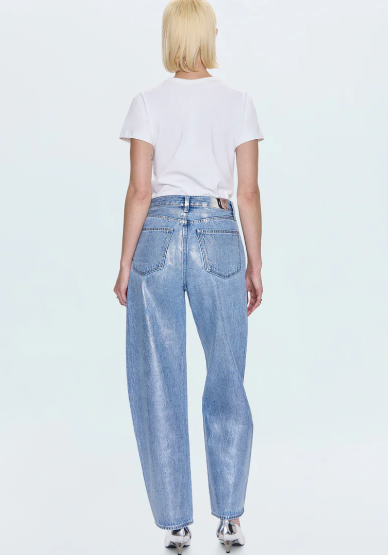 The best-selling jean that redefines modern denim. Wes sits at a flattering high rise with a stylish barrel leg silhouette and full-length 30" inseam that creates sophisticated drama. Clean hem finishes add polished detail to the contemporary silhouette. Crafted from our premium rigid non-stretch denim in Spellbound, a captivating light blue wash with a luminous sheen that catches the light beautifully. Finished with a branded metallic patch on the back that adds signature shine.