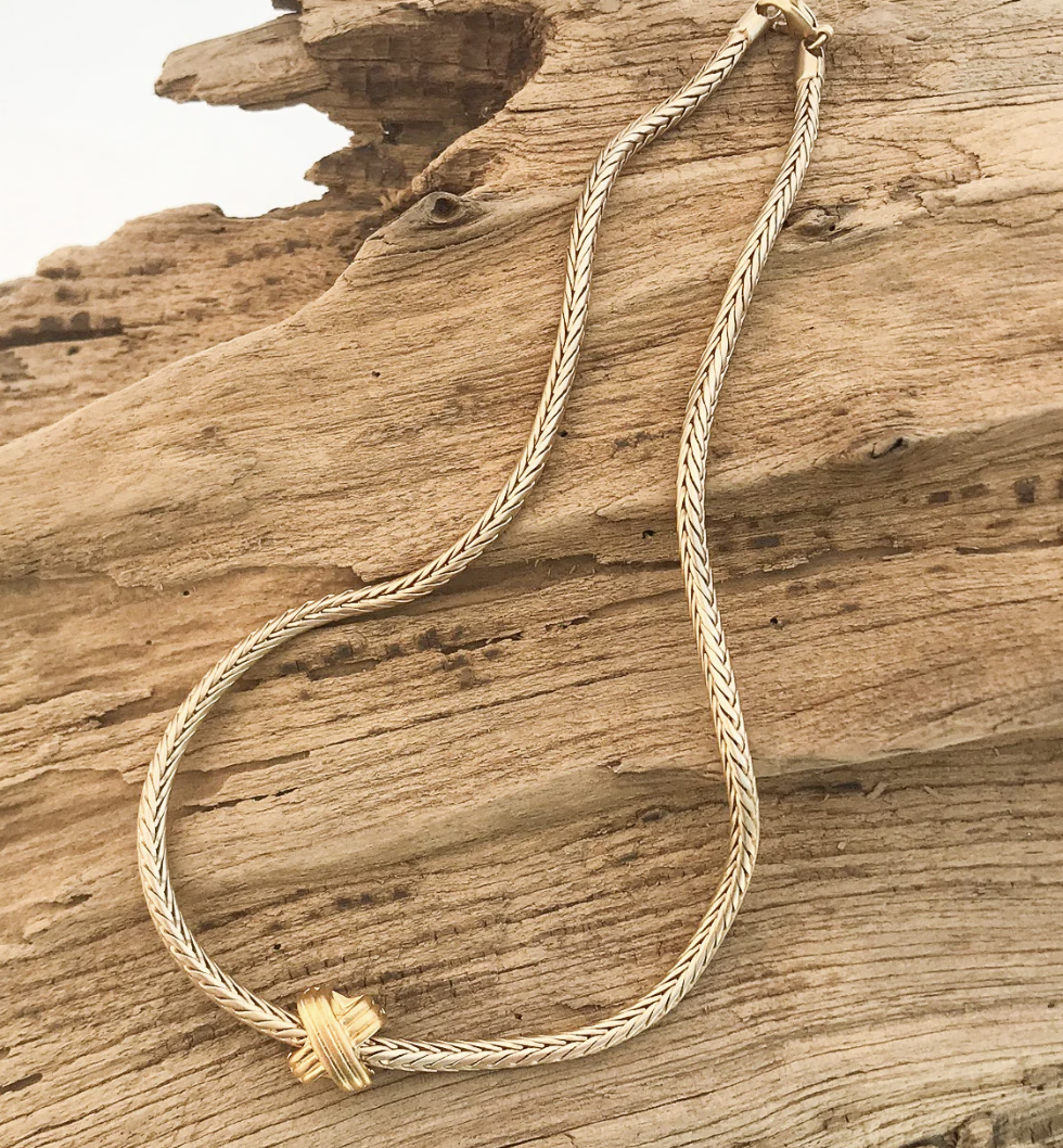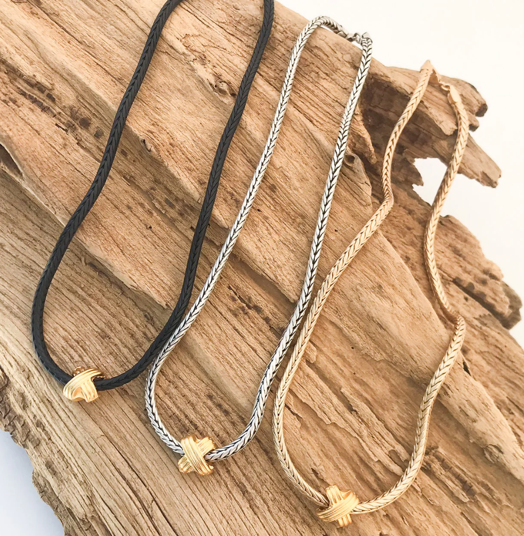 Add a playful sparkle to your look with this gold crossover necklace. Its unique bead detail on a round python chain brings a fun twist to any outfit, making it the perfect gift to dazzle and delight. Get ready to turn heads wherever you go!